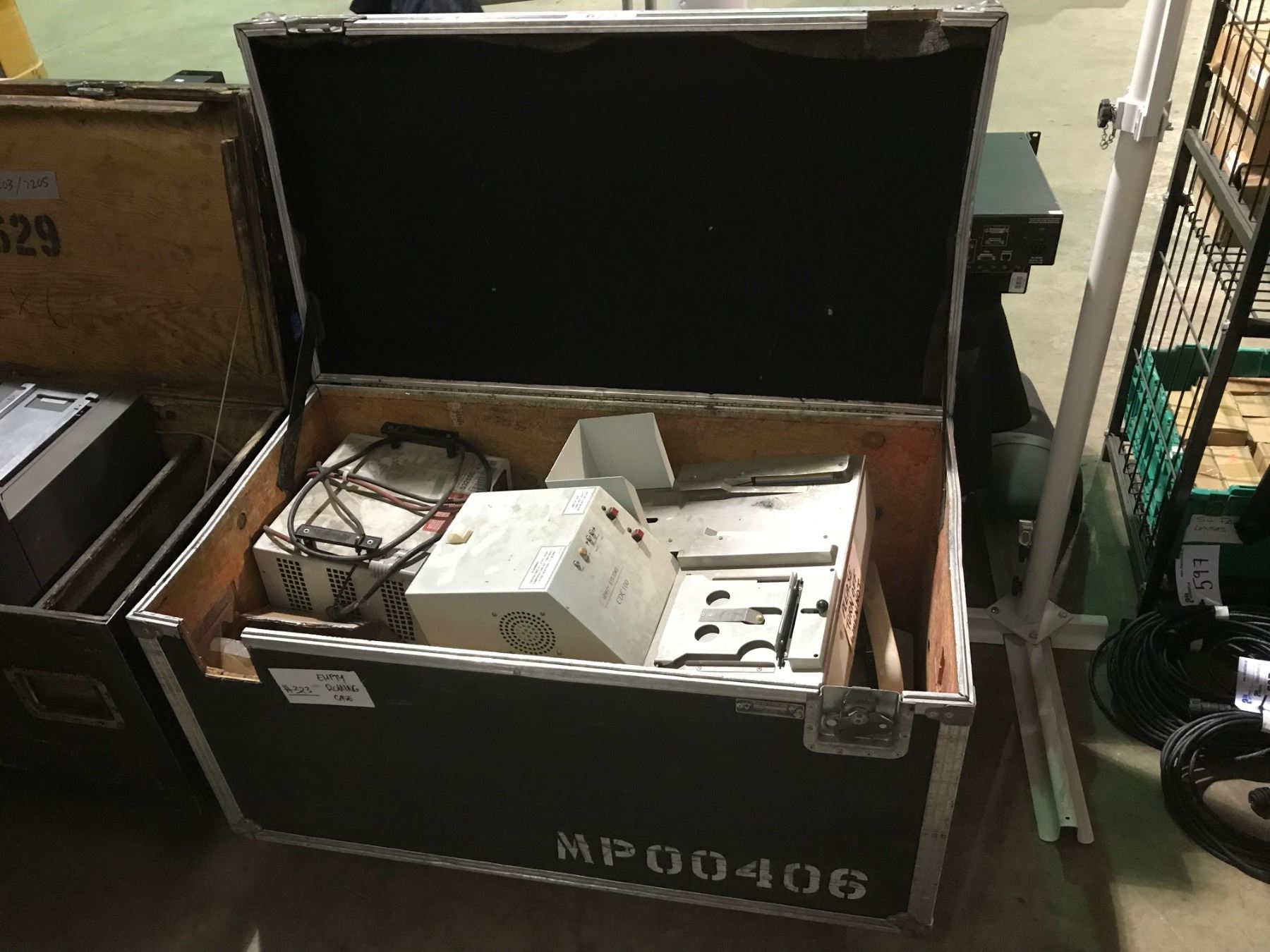 29"H X 44"W X 23"D BLACK WOOD MOBILE ROAD CASE WITH INDUSTRIAL CHARGER & MISC ELECTRONICS
