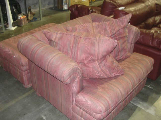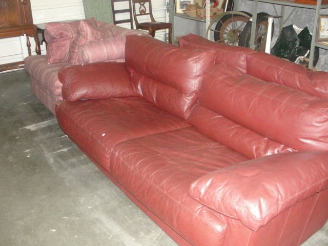 2PC BURGANDY LEATHER SOFA AND LOVESEAT SET AND A LARGE OVER STUFFED UPHOLSTERED LIVING ROOM ARM CHAIR AND MATCHING FOOTSTOOL
