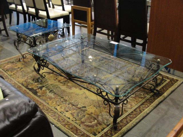 2PC GLASS TOP COFFEE AND END TABLE SET; END TABLE GLASS TOP HAS SMALL CHIP PRESENT