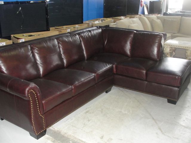 2PC MAROON LEATHER SECTIONAL SOFA WITH BRASS BUTTON FRONT ACCENTS