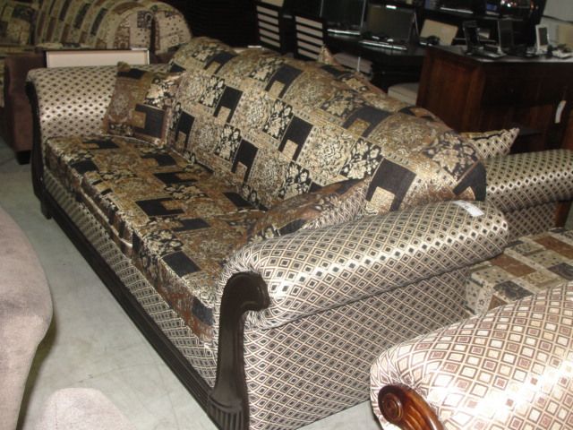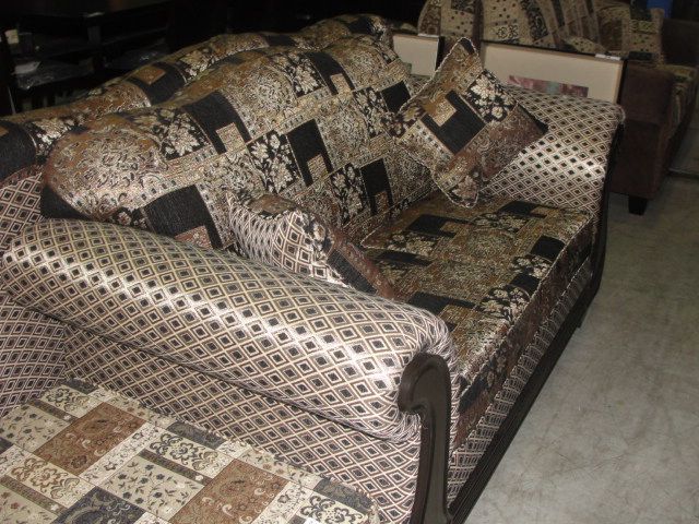 2PC SOFA AND LOVESEAT SET - DIAMOND AND FLORAL PATTERNED UPHOLSTERY VARIOUS SHADES OF BEIGE, BLACK AND GOLD