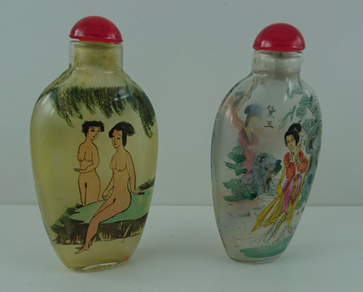 2X HANDPAINTED SNUFF BOTTLES WITH LIDS/STOPPER