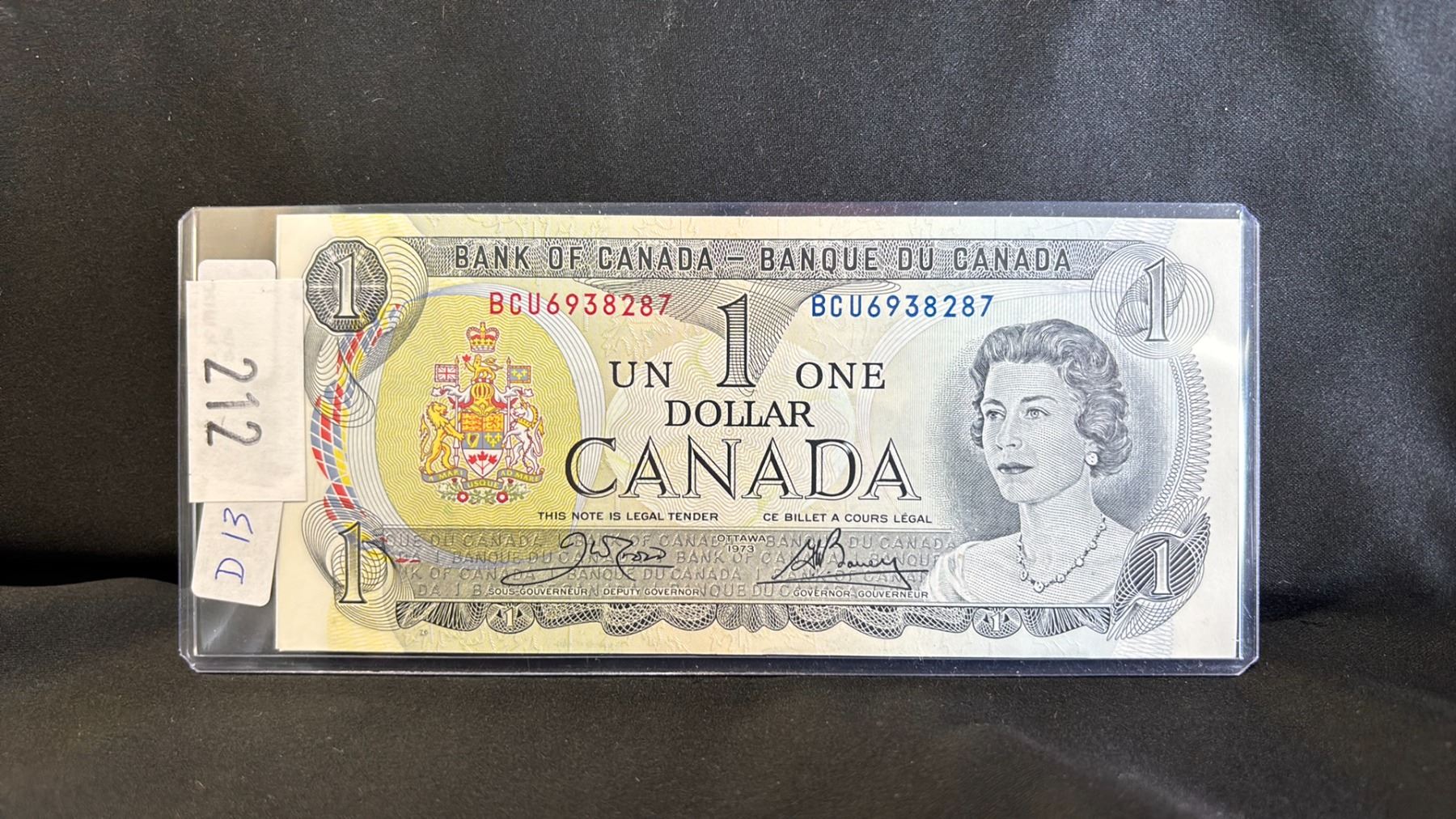 (3) 1973 CANADA 1 DOLLAR BILLS IN SLEEVE. SEQUENTIAL SERIAL NUMBERS