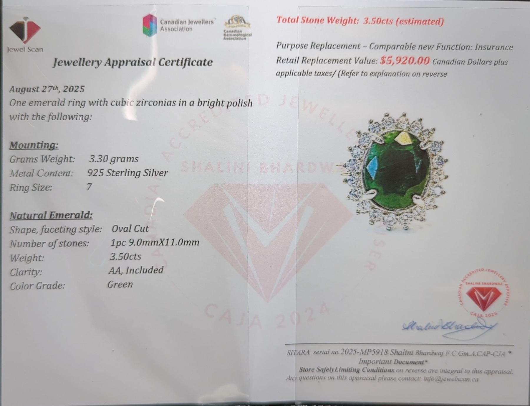 3.3 CT CERTIFIED SILVER EMERALD GEMSTONE RING ($5,920 APPRAISAL, APPRAISAL NOT GUARANTEED)