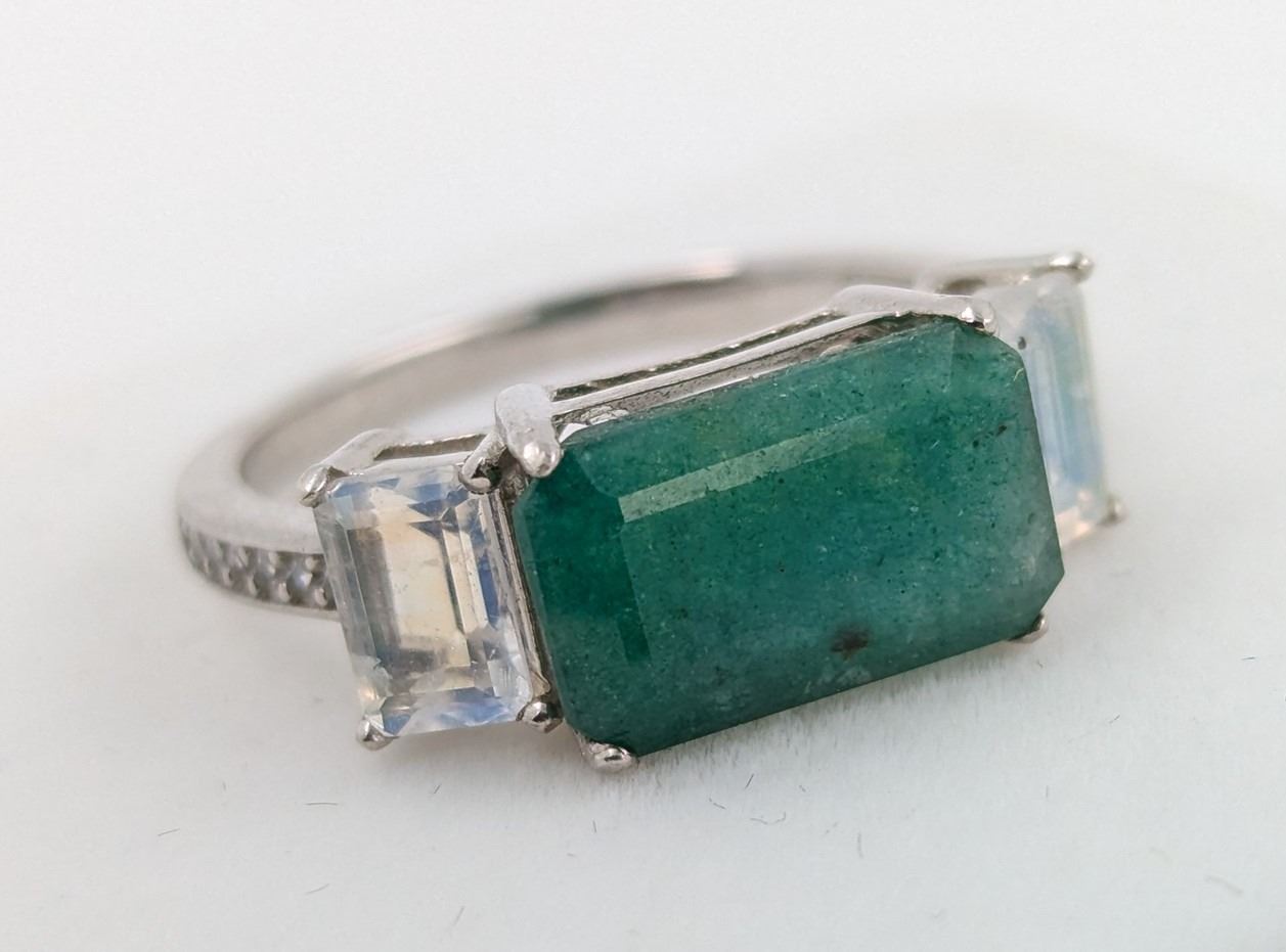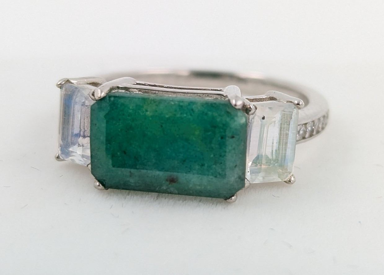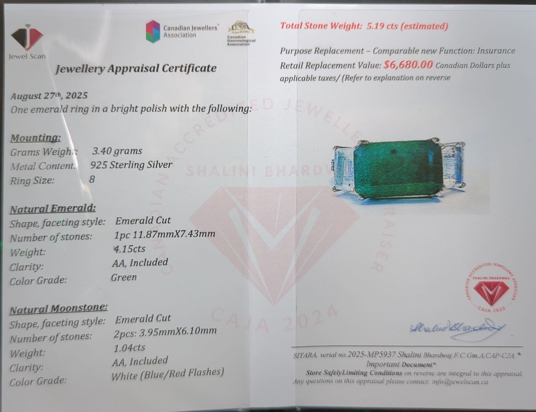 3.4 CT CERTIFIED SILVER EMERALD GEMSTONE RING ($6,680 APPRAISAL, APPRAISAL NOT GUARANTEED)