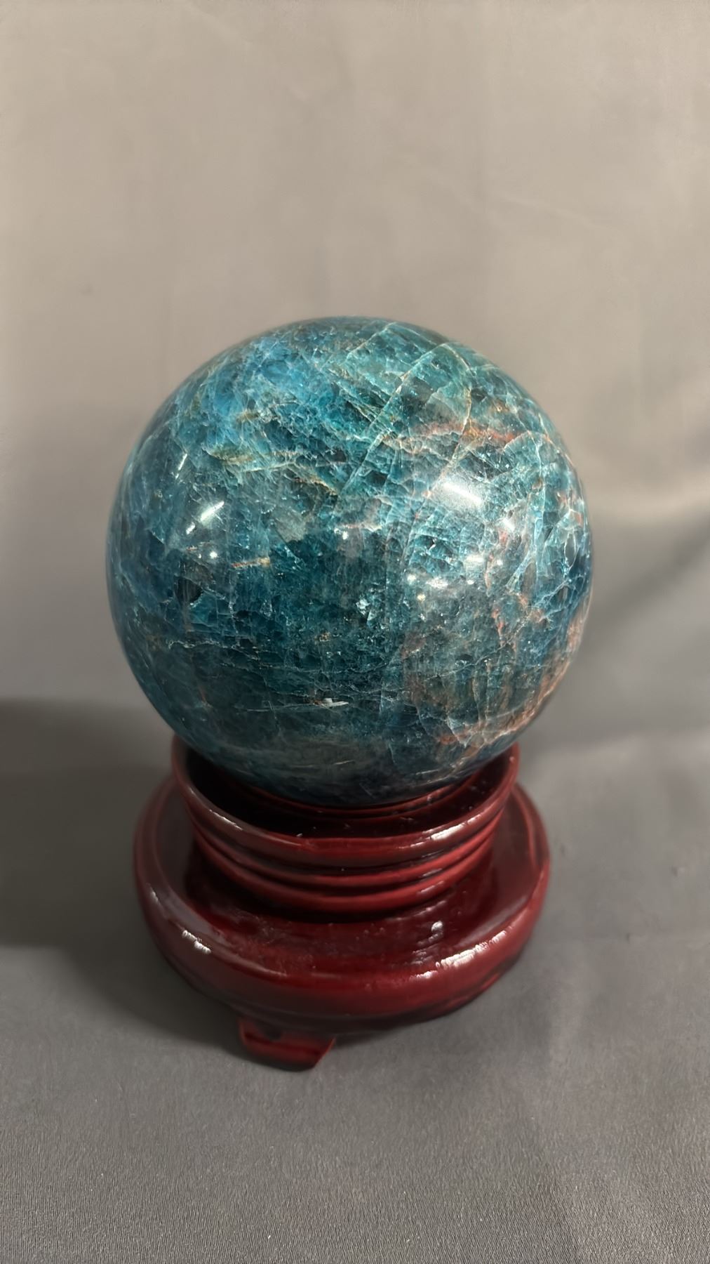 3.5" BLUE APATITE SPHERE ON ROTATING WOOD STAND