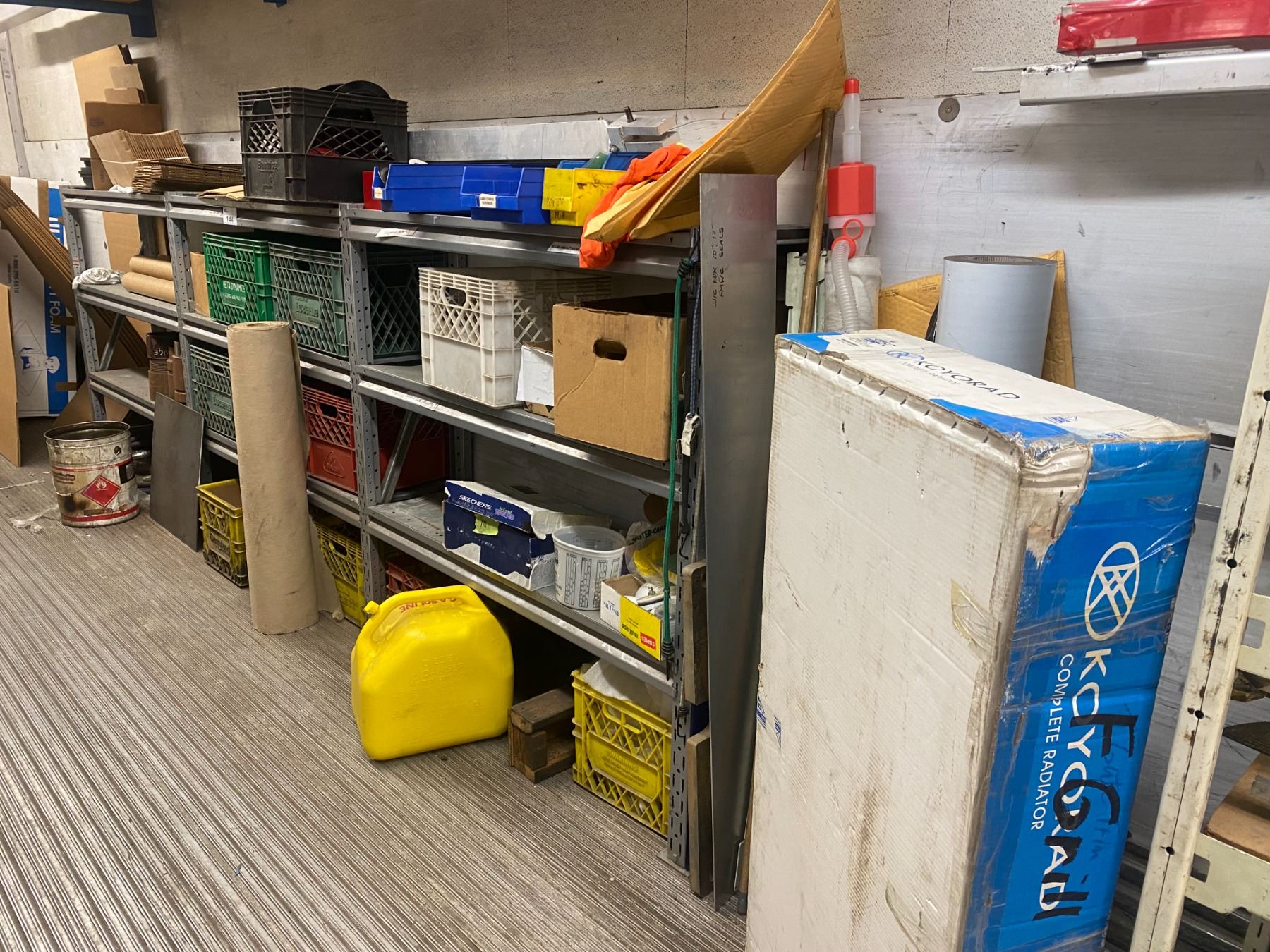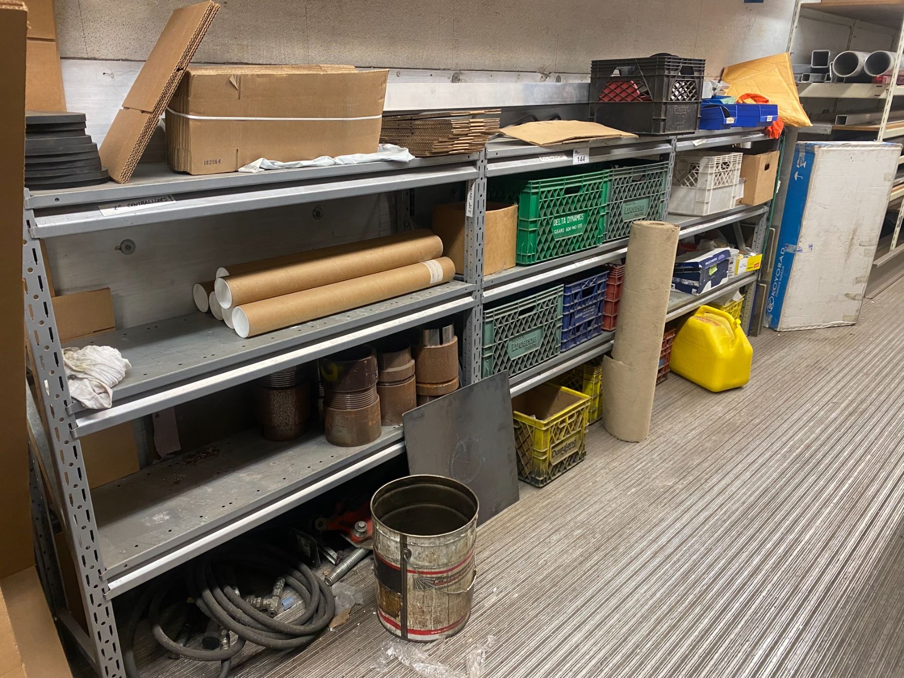 3 ADJUSTABLE SHELVING UNITS OF ASSORTED PRODUCTION STOCK & CONTENTS OF CORNER OF STORAGE TRAILER (ITEMS MAY VARY FROM PICTURE PLEASE PREVIEW)