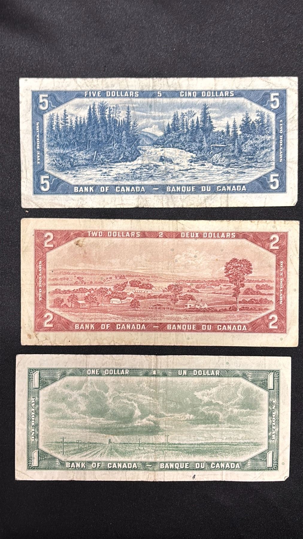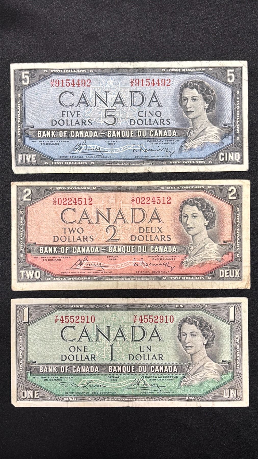 (3) ASSORTED 1954 CANADIAN BANK NOTES INCLUDING; (1 OF EACH) $5, $2, $1