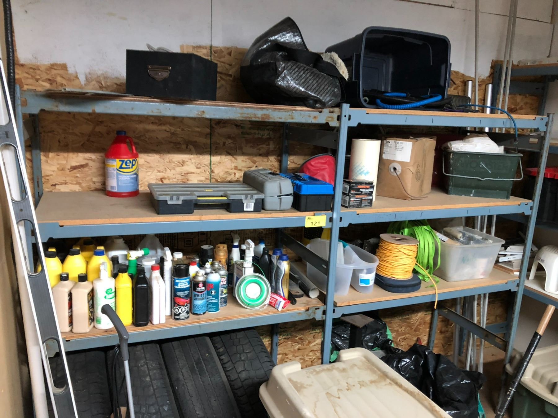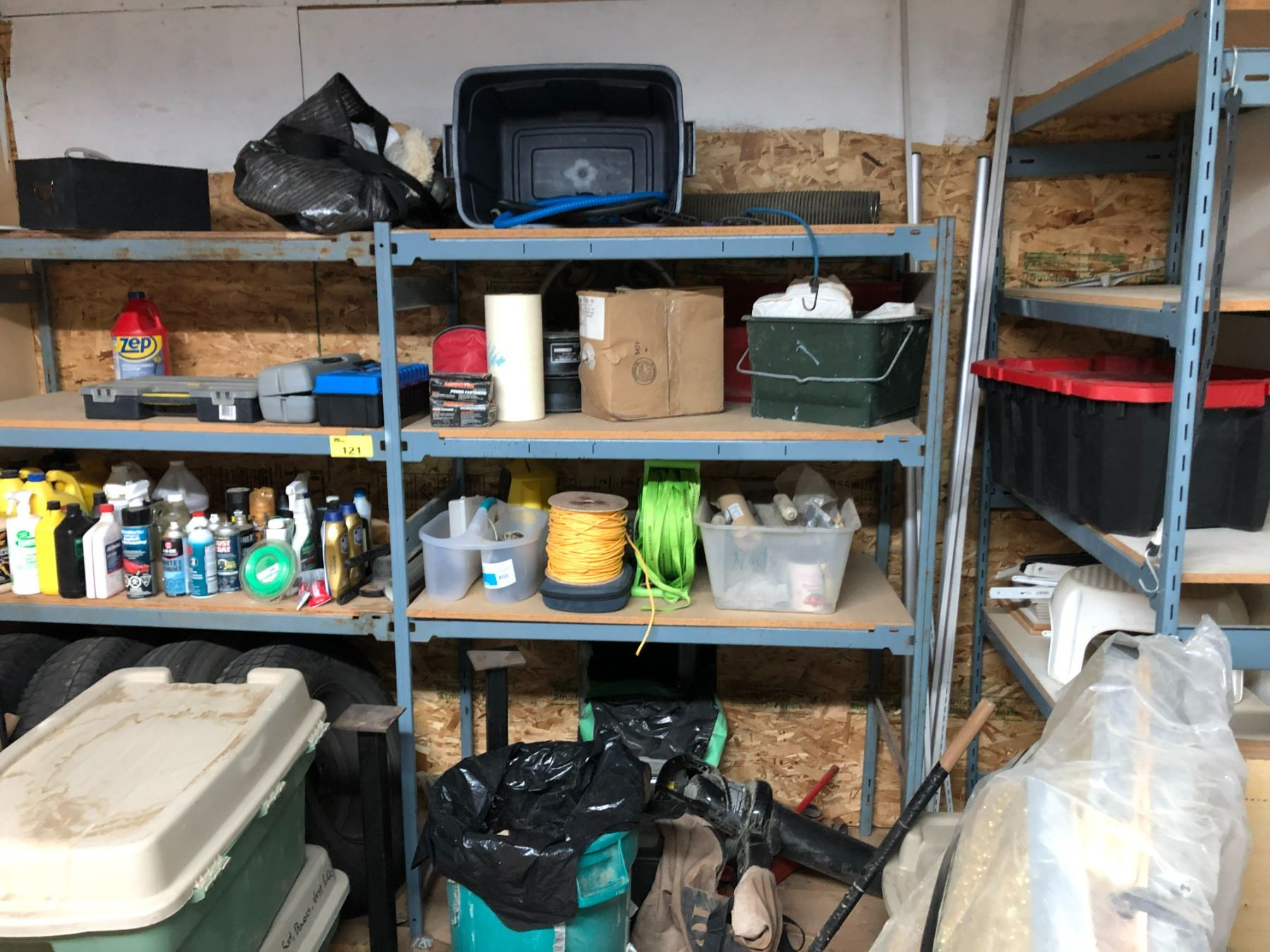 3 ASSORTED BAYS OF INDUSTRIAL PRODUCT STORAGE SHELVES AND CONTENTS INCLUDING 2 SLEDGE HAMMERS, TORO CORDLESS LEAF BLOWER/VACUUM, HYDRAULIC CAR JACK, ROPE, STRAPS, TOOL BOXES, EMPTY TOTES,  ASSORTED OILS AND PAINTS   *MUST TAKE ALL* (LOCATED ON 2ND FLOOR)
