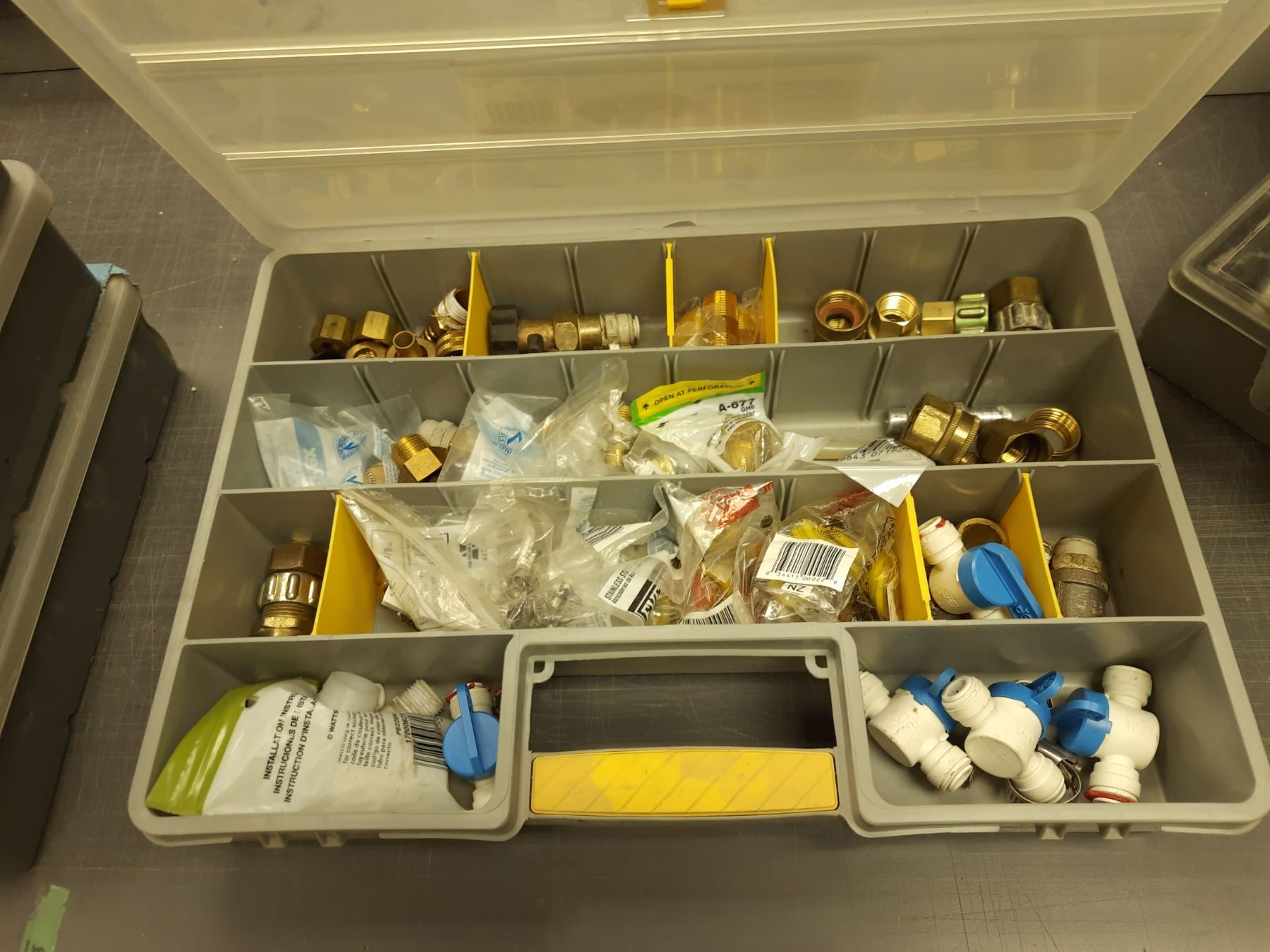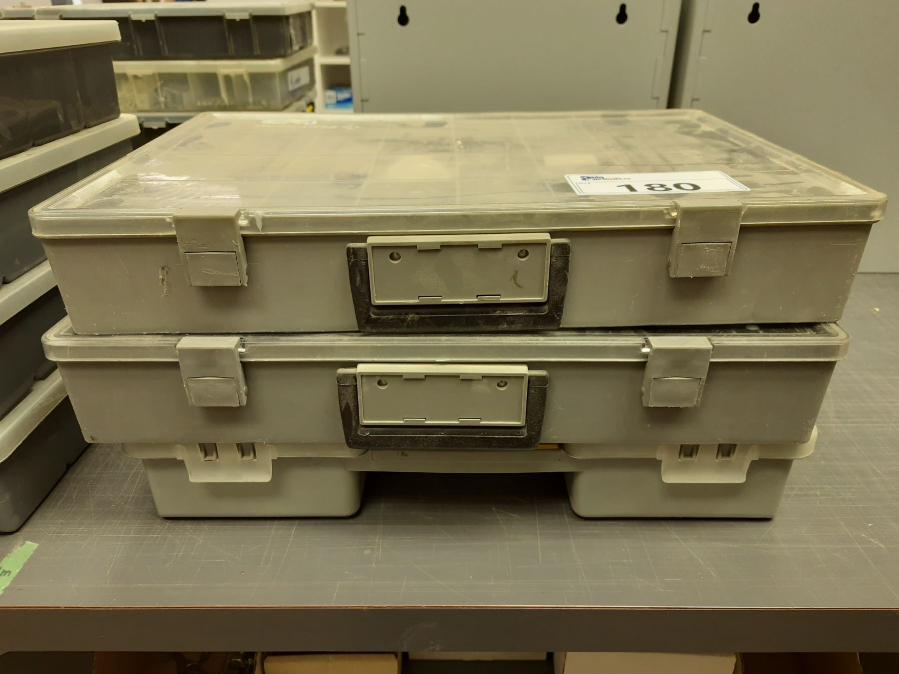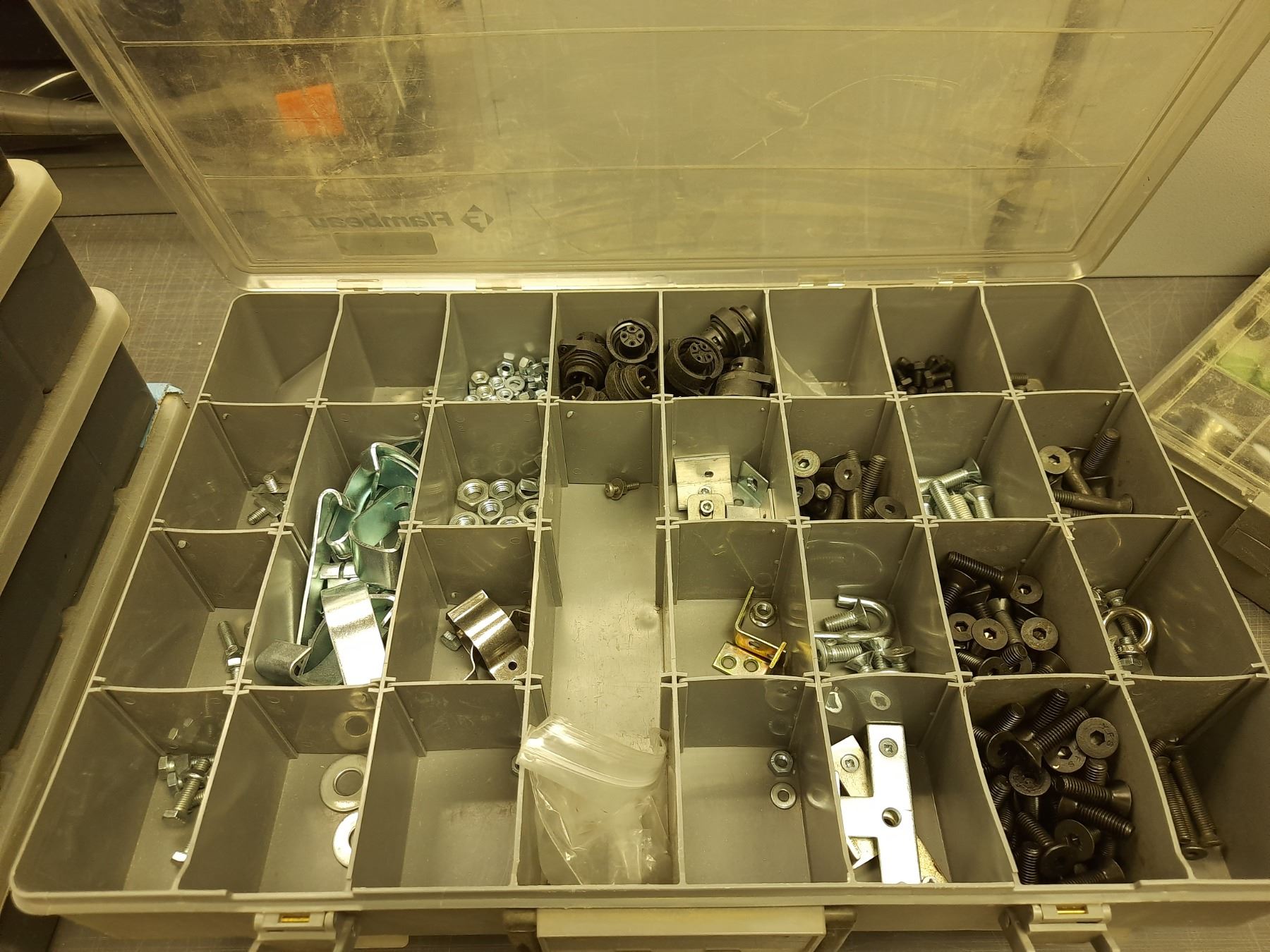 3 ASSORTED MOBILE PARTS ORGANIZER/CARRIER WITH CONTENTS OF ASSORTED HARDWARE INCLUDING NUTS, BOLTS, WASHERS, AND COUPLINGS