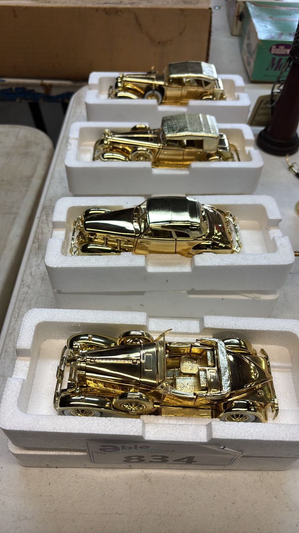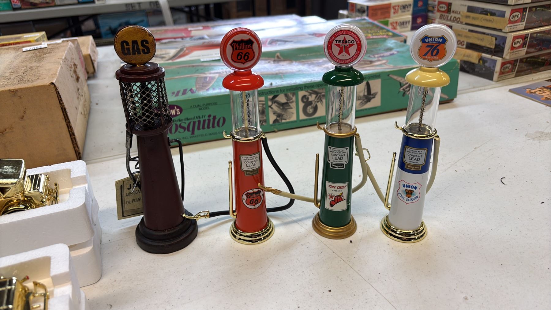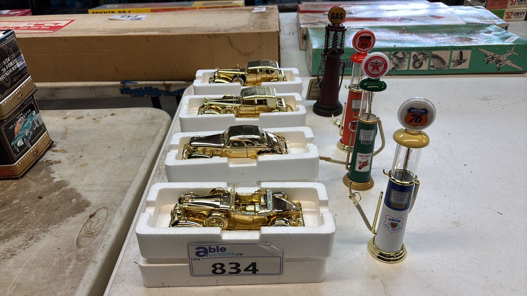 (3) ASSORTED PLASTIC SCALE MODEL CARS & (4) MINIATURE GAS PUMP MODELS