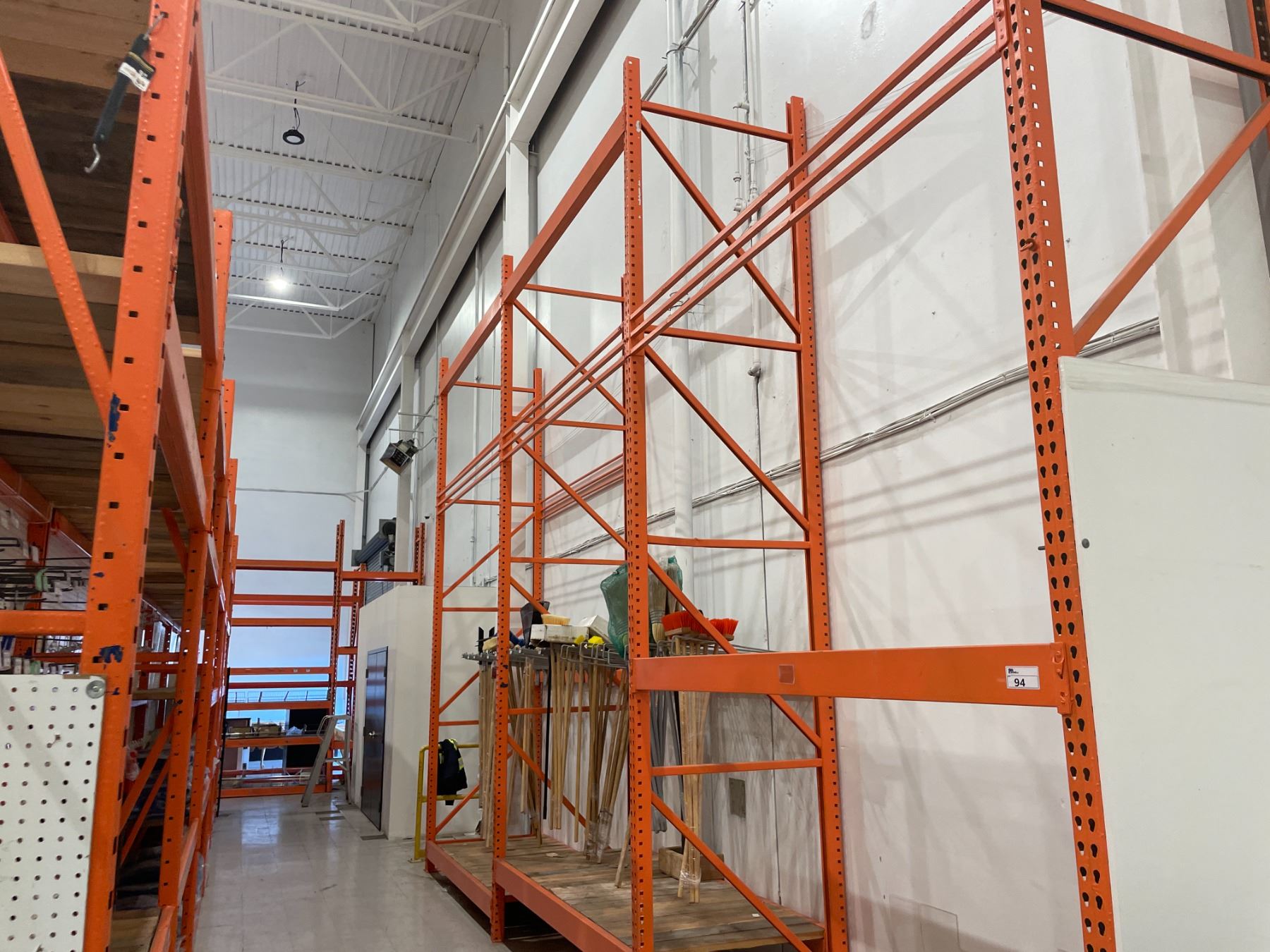 3 BAYS OF ORANGE 14' TALL 42" DEPTH 8' WIDE CROSSBAR ADJUSTABLE INDUSTRIAL PARTS RACKING