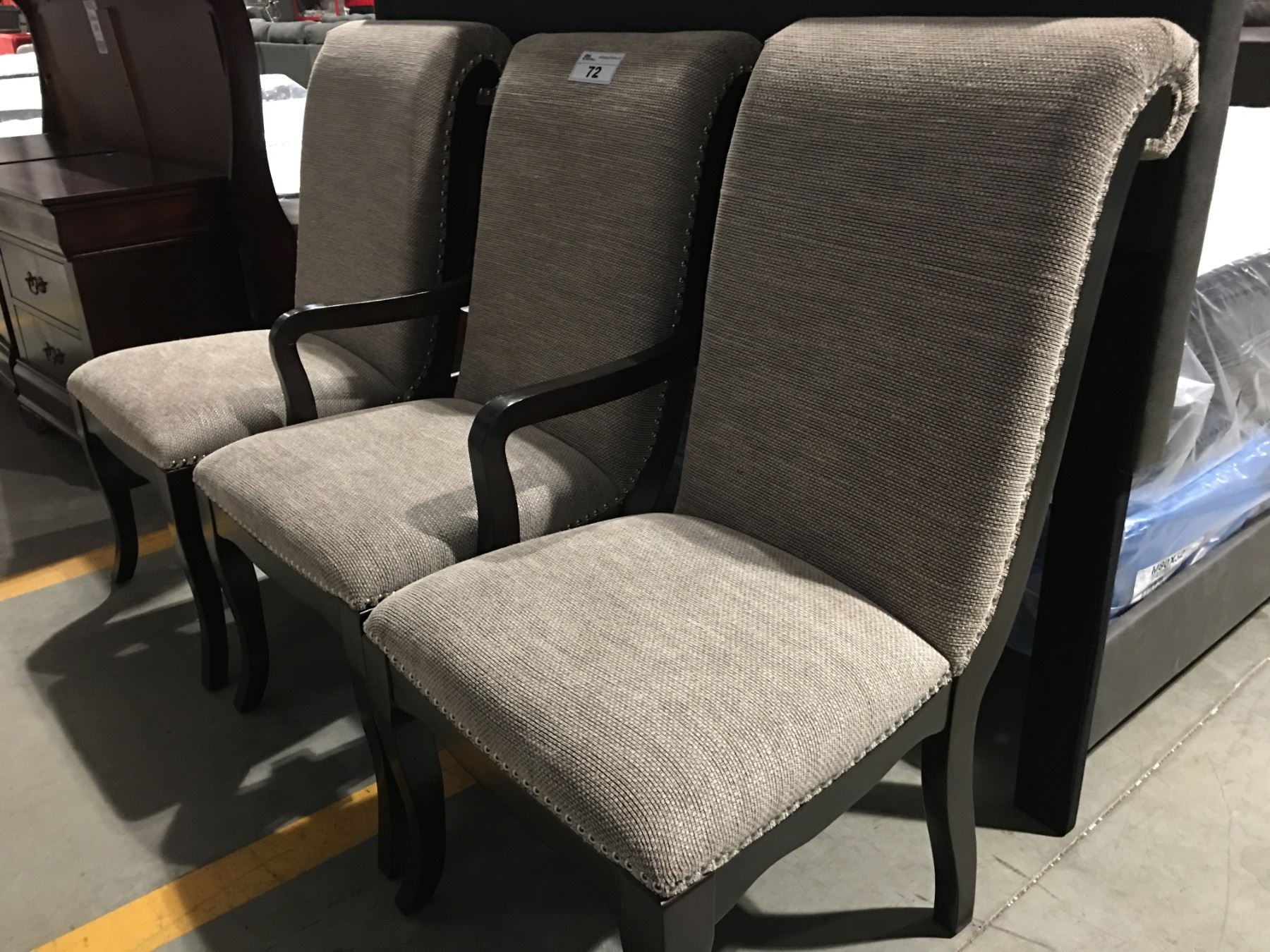 3 BEIGE UPHOLSTERED DINING ROOM CHAIRS WITH DARK WOOD LEGS