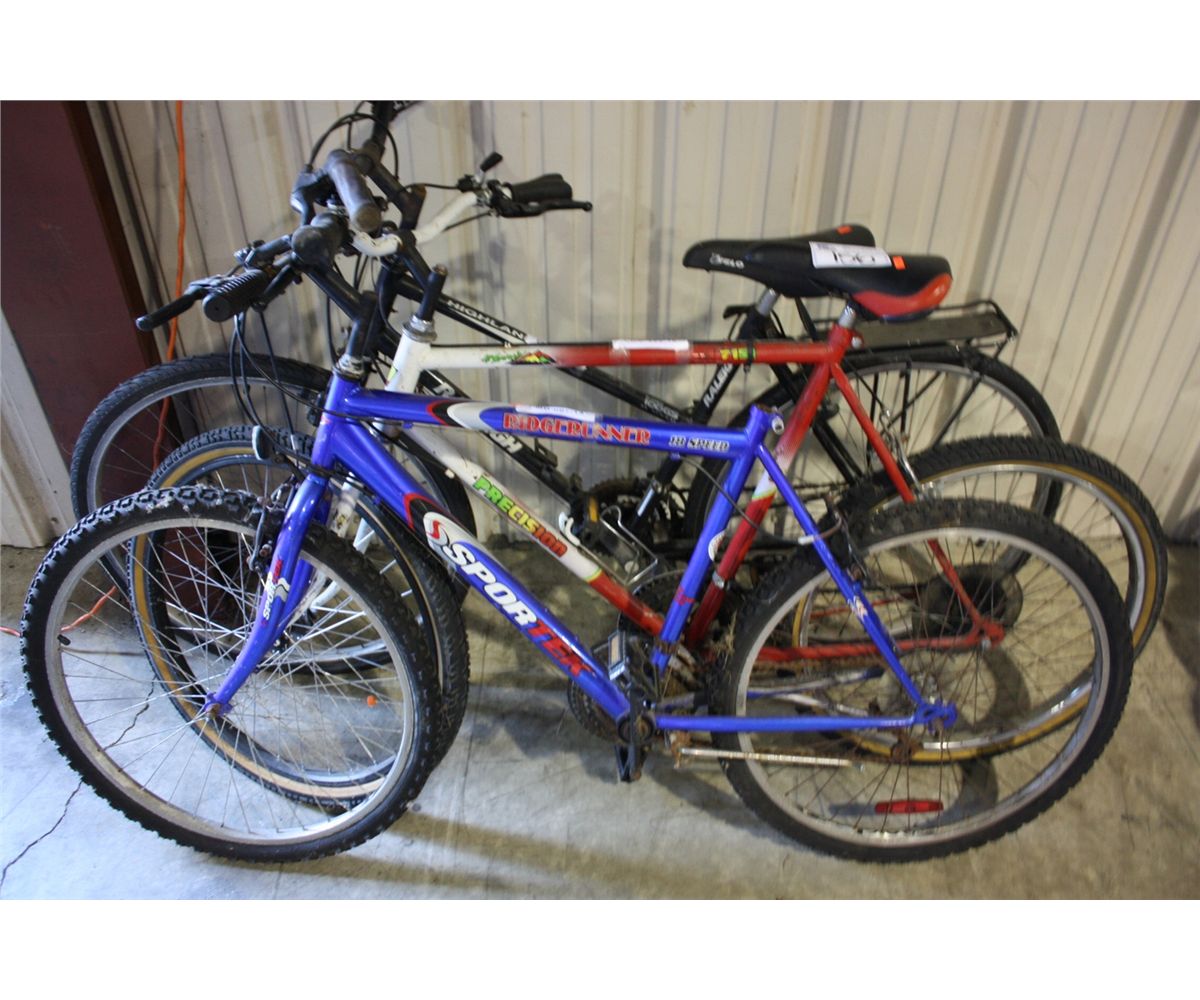 3 BIKES - BLUE SPORTEK 18 SPEED MOUNTAIN BIKE, RED PRECISION 12 SPEED MOUNTAIN BIKE, BLACK RALEIGH 12 SPEED TOUR BIKE