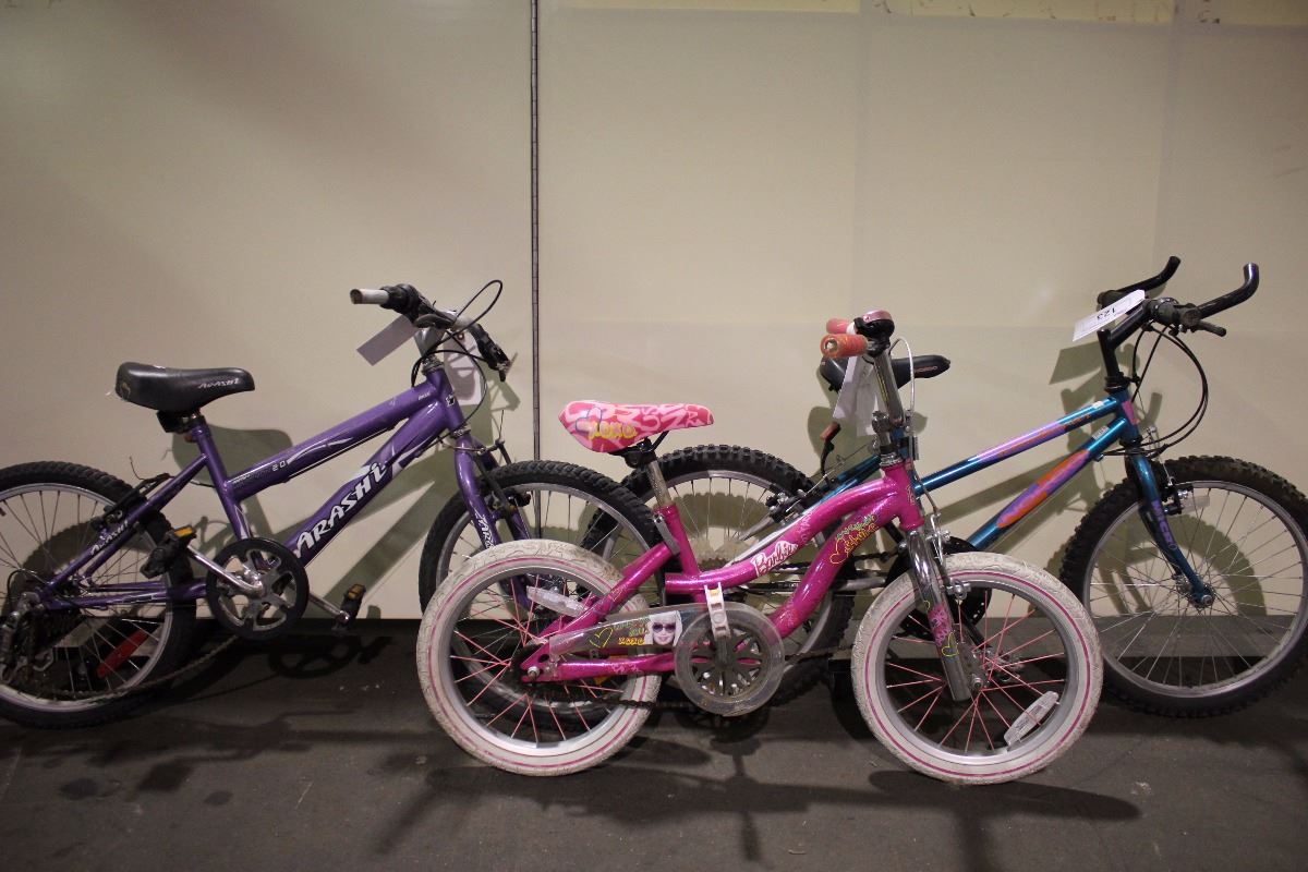 3 BIKES: KIDS PURPLE ARASHI MOUNTAIN BIKE, KIDS PINK BARBIE BIKE & KIDS GREEN NORCO MOUNTAIN BIKE