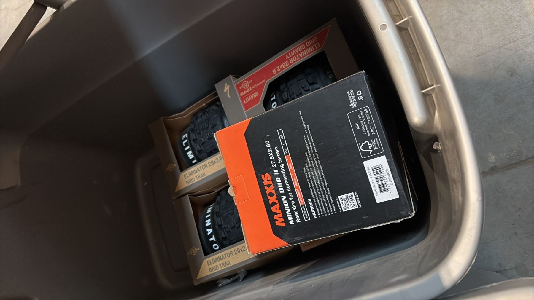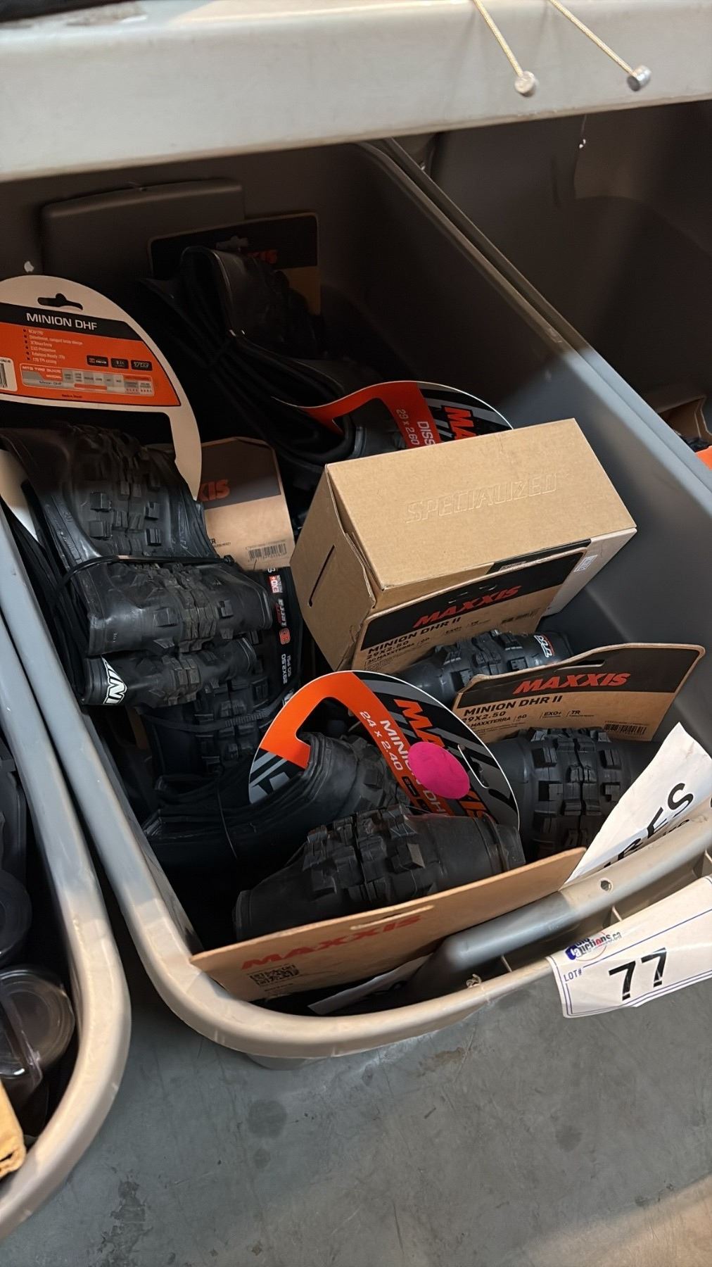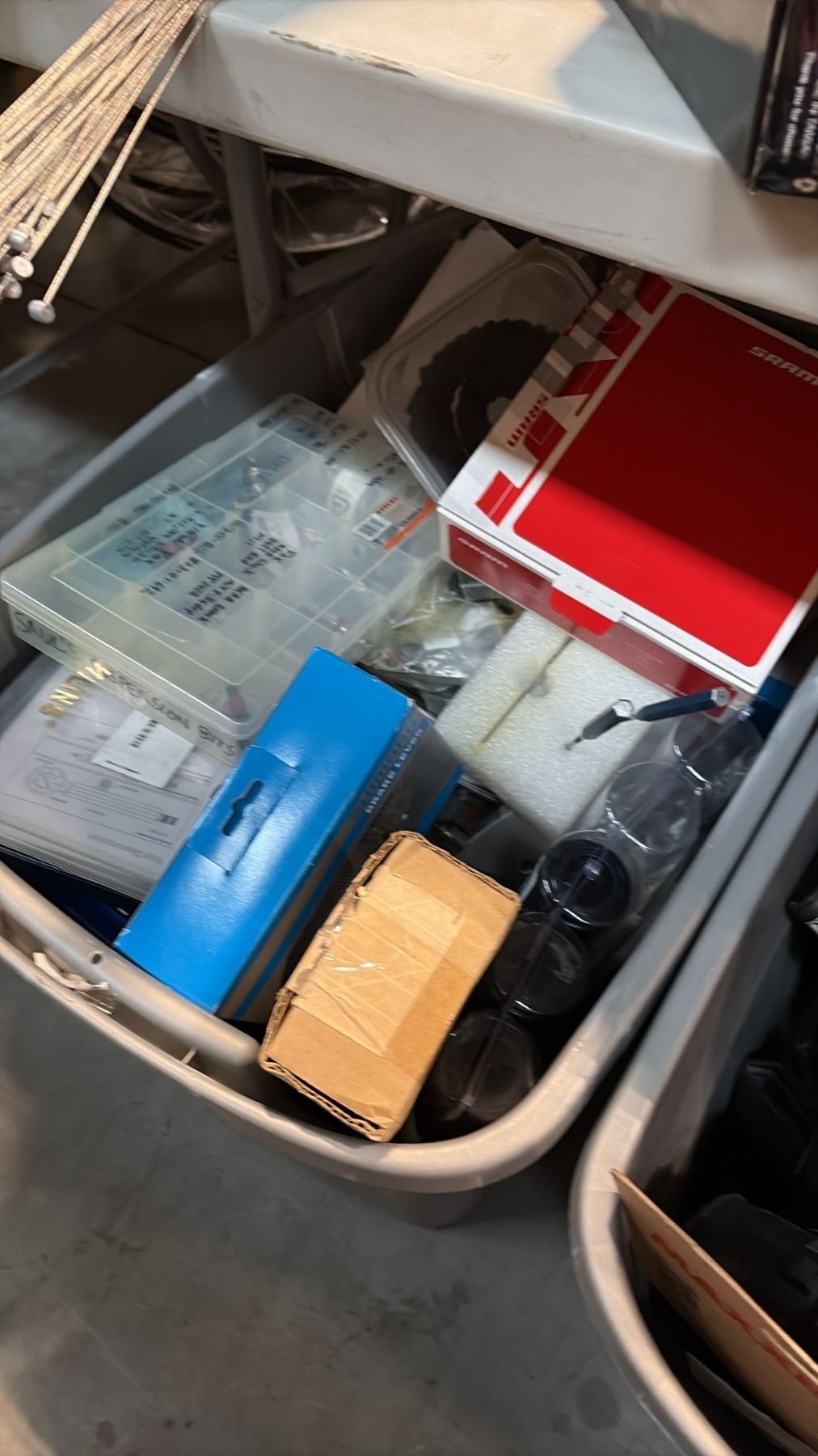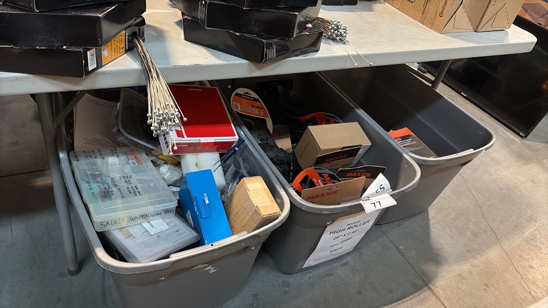 3 BINS OF MIXED ITEMS INCL PARK TOOL TOOLS, SHIMANO, MAXXIS BIKE TIRES AND MORE