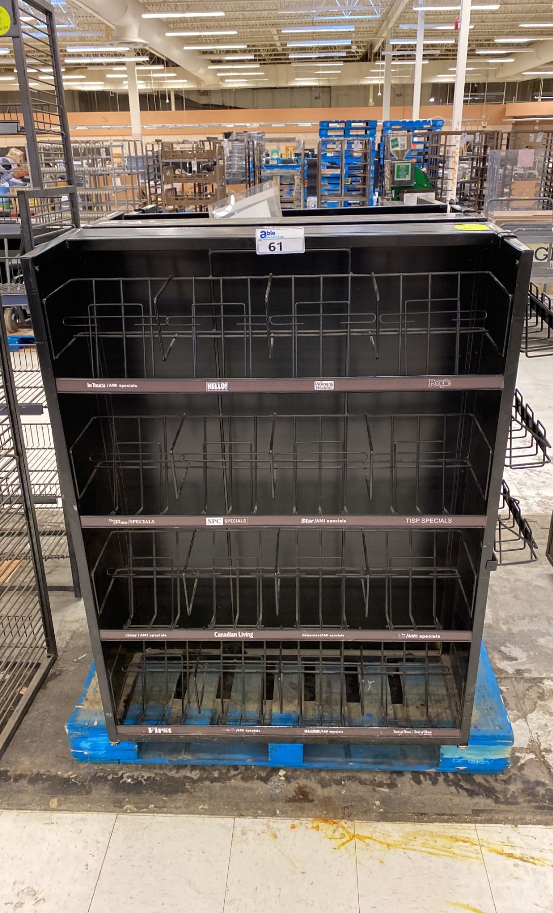 3 BLACK METAL MAGAZINE STANDS ON A PALLET