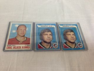 3 BOBBY HULL COLLECTOR CARDS INCL 2 1979 O-PEE-CHEE WINNIPEG JET CARDS & A 1970 CHICAGO BLACKHAWK CARD