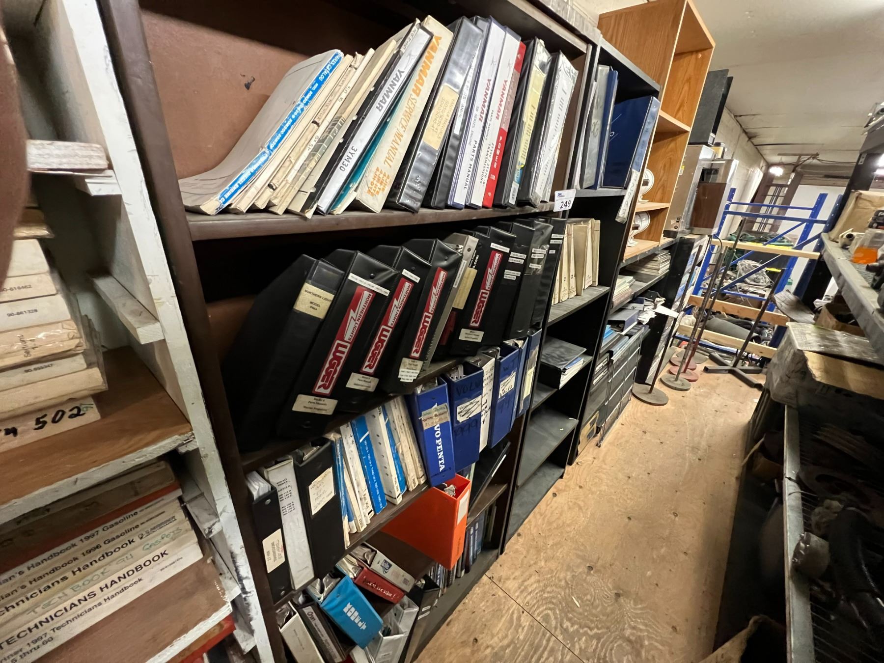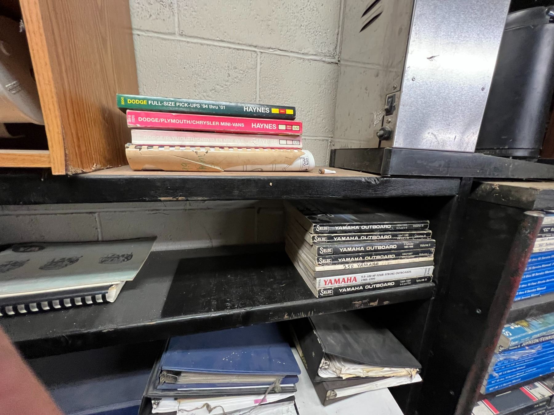 3 BOOKSHELVES OF MANUALS AND BINDERS WITH MANUALS. VOLVO, YANMAR, DETROIT DIESEL