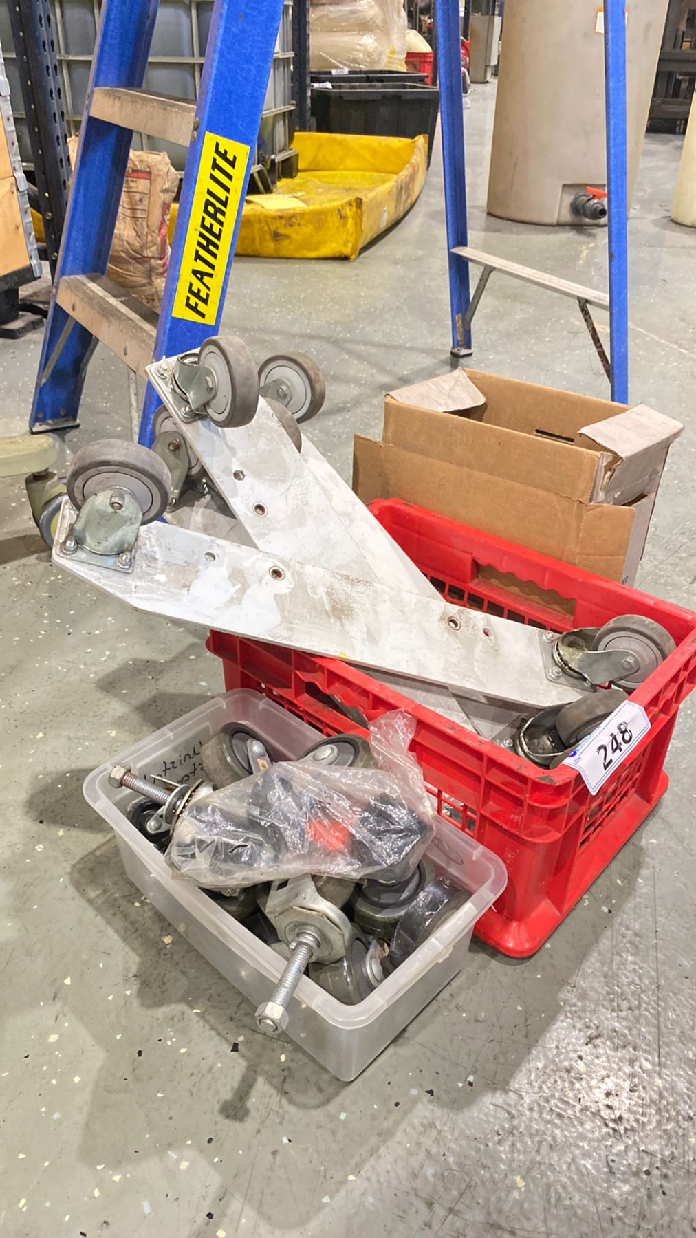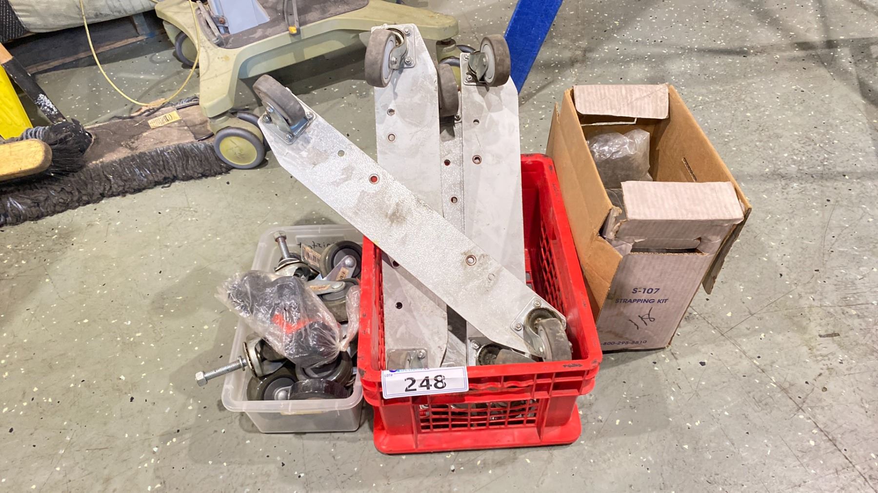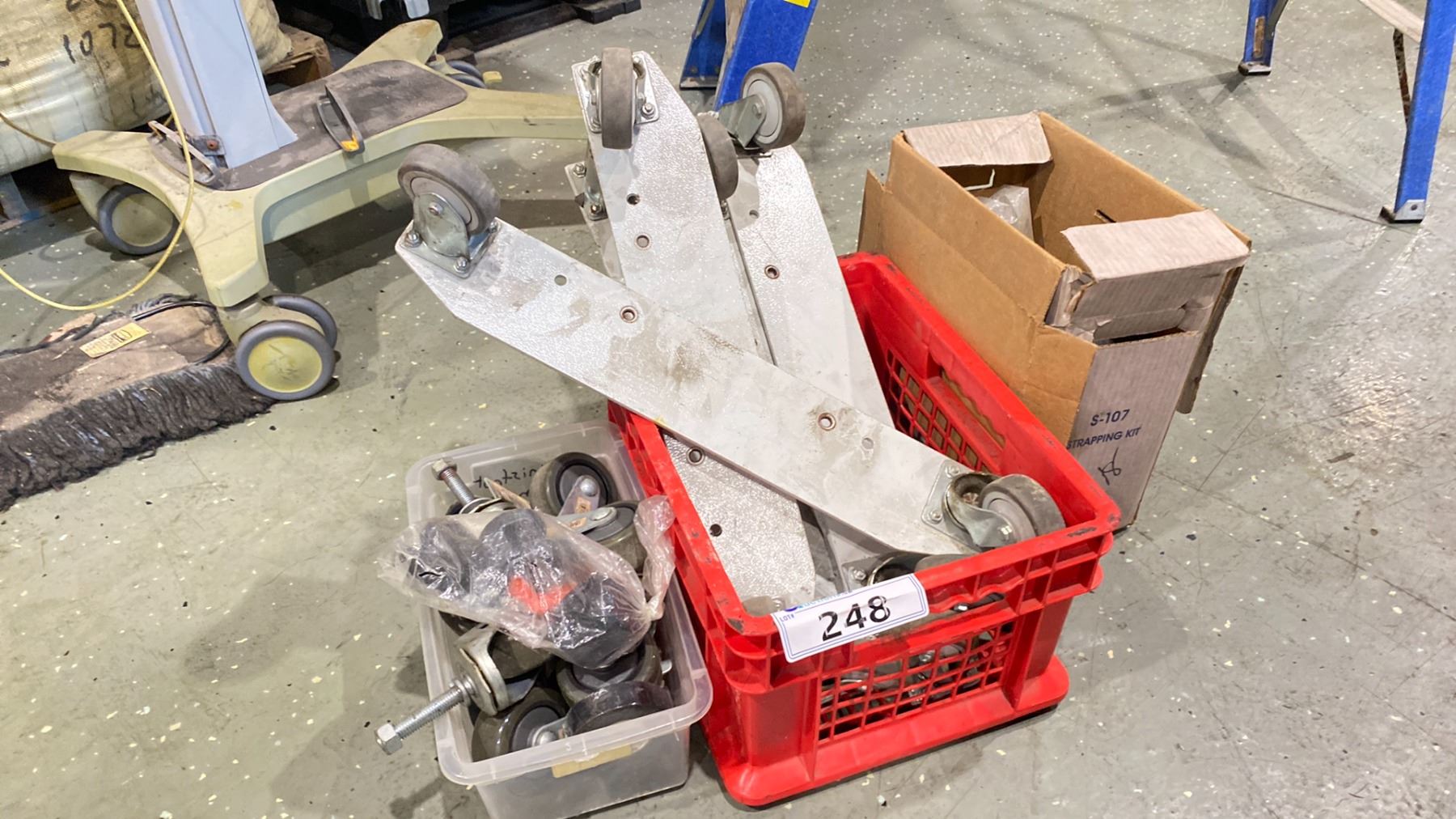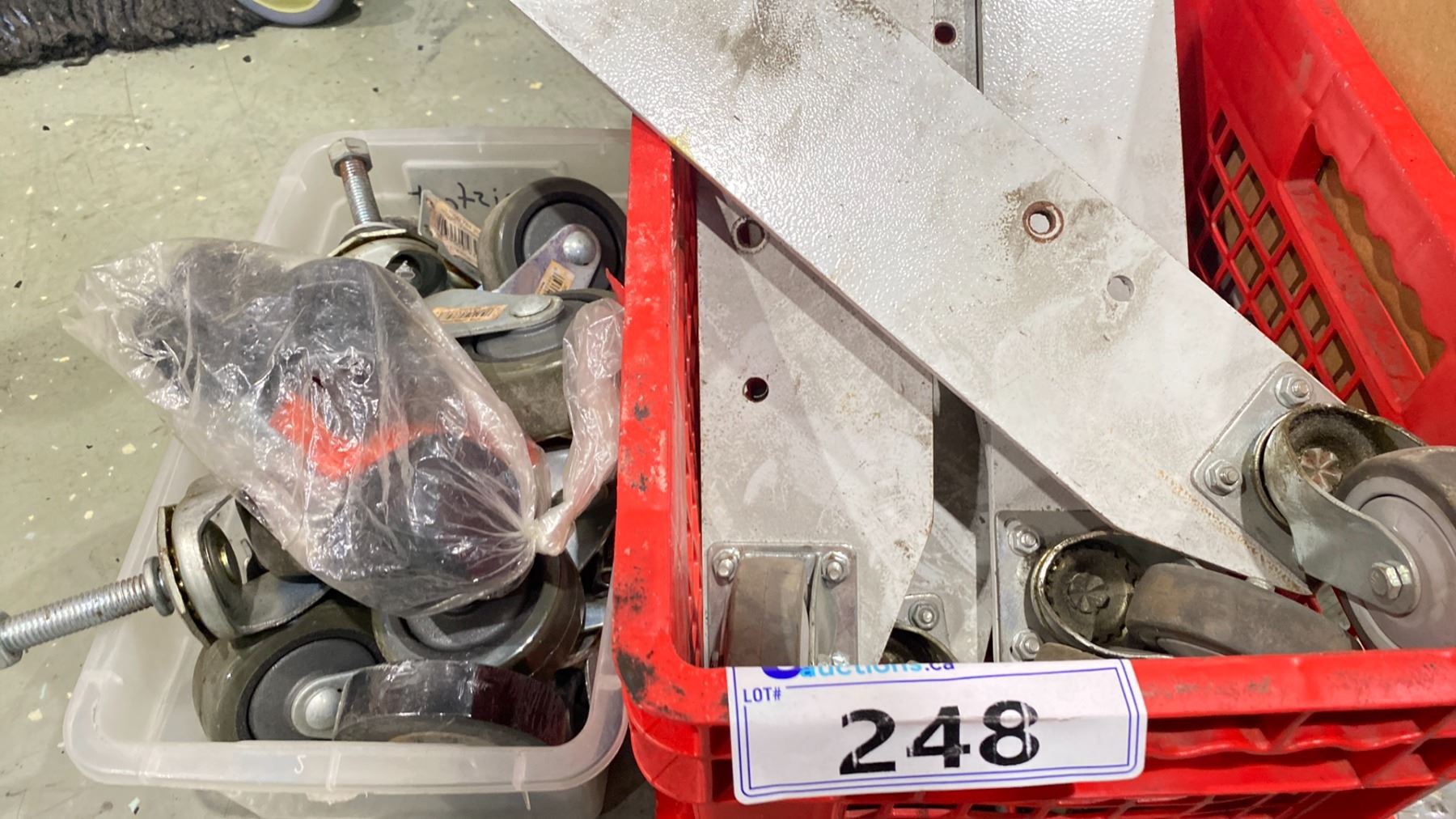 3 BOXES OF ASSORTED CASTORS & BAND STRAPPING MATERIAL