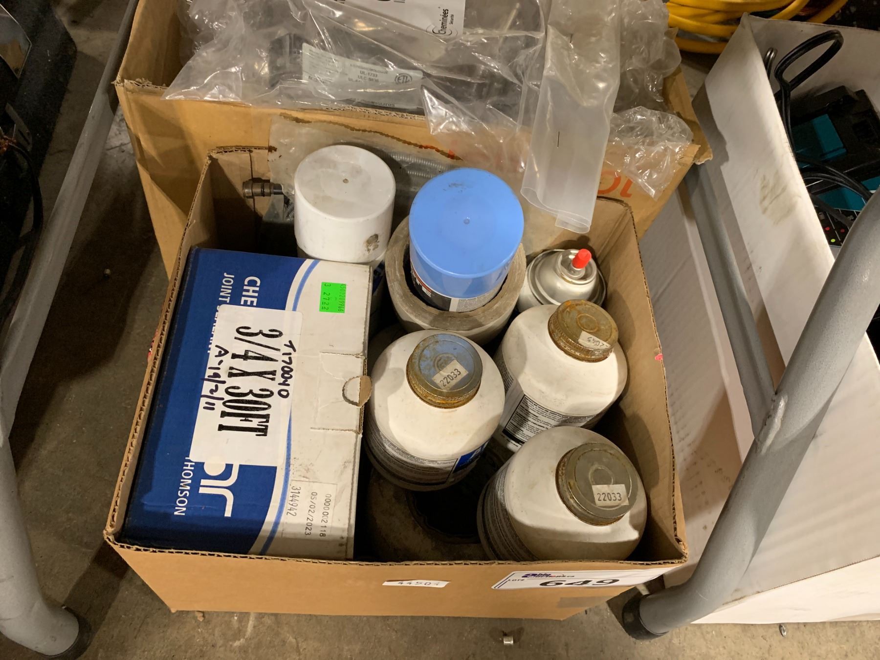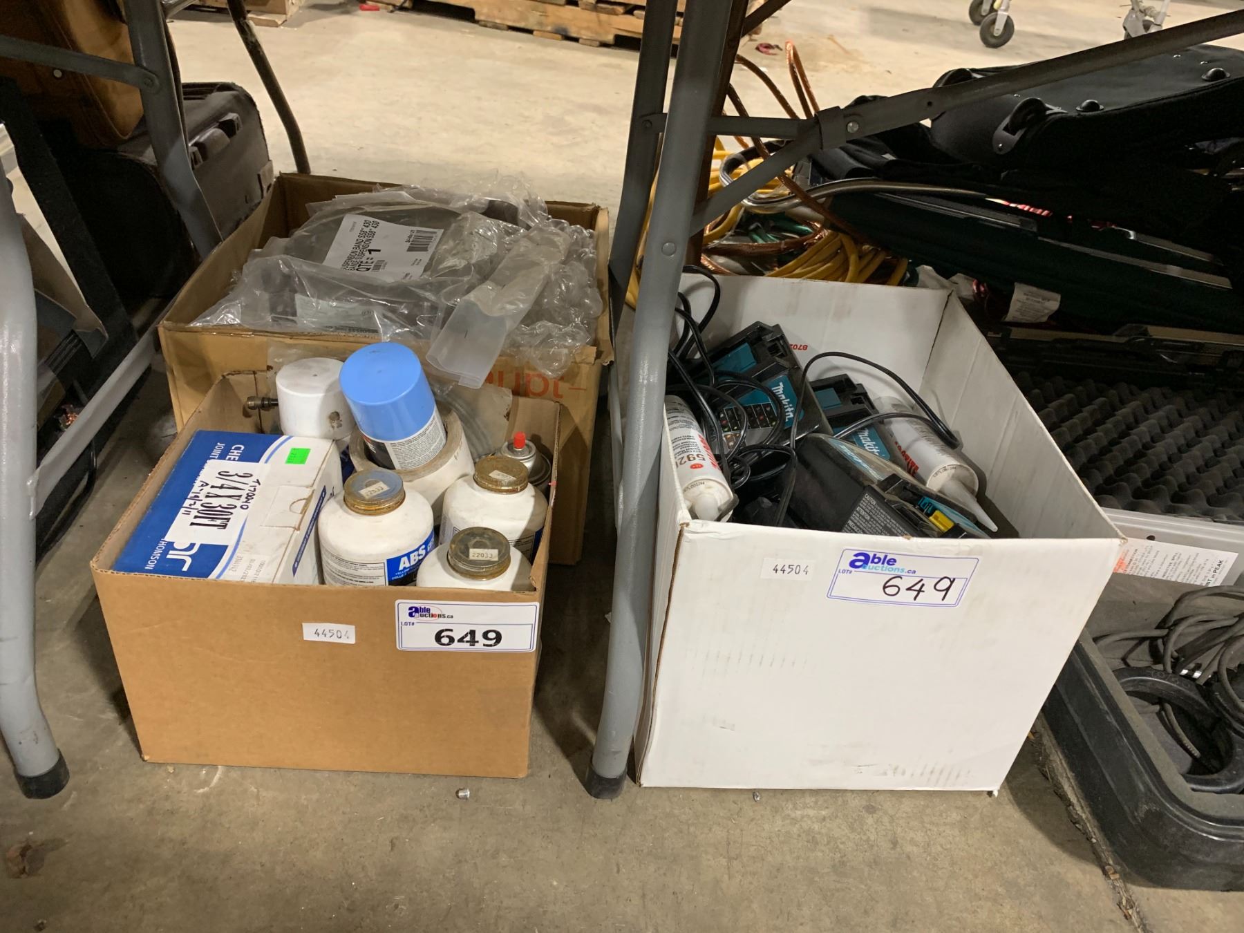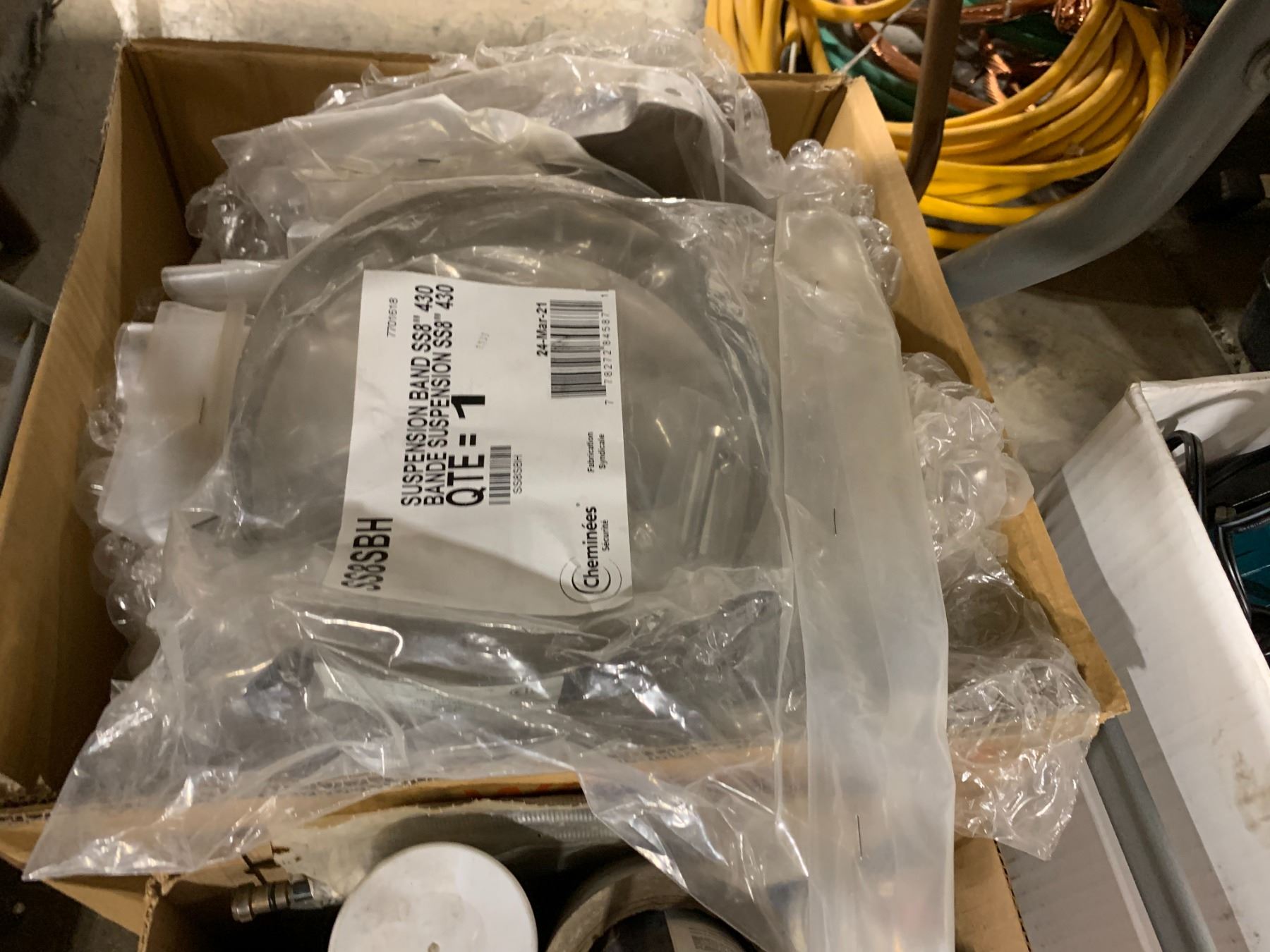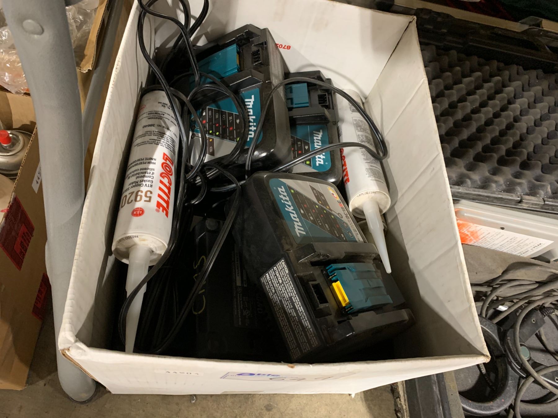3 BOXES OF ASSORTED MAKITA BATTERY CHARGERS, ABS Y2DS SOLVENT CEMENT, CHEMINEES SUSPENSION BAND & MISC