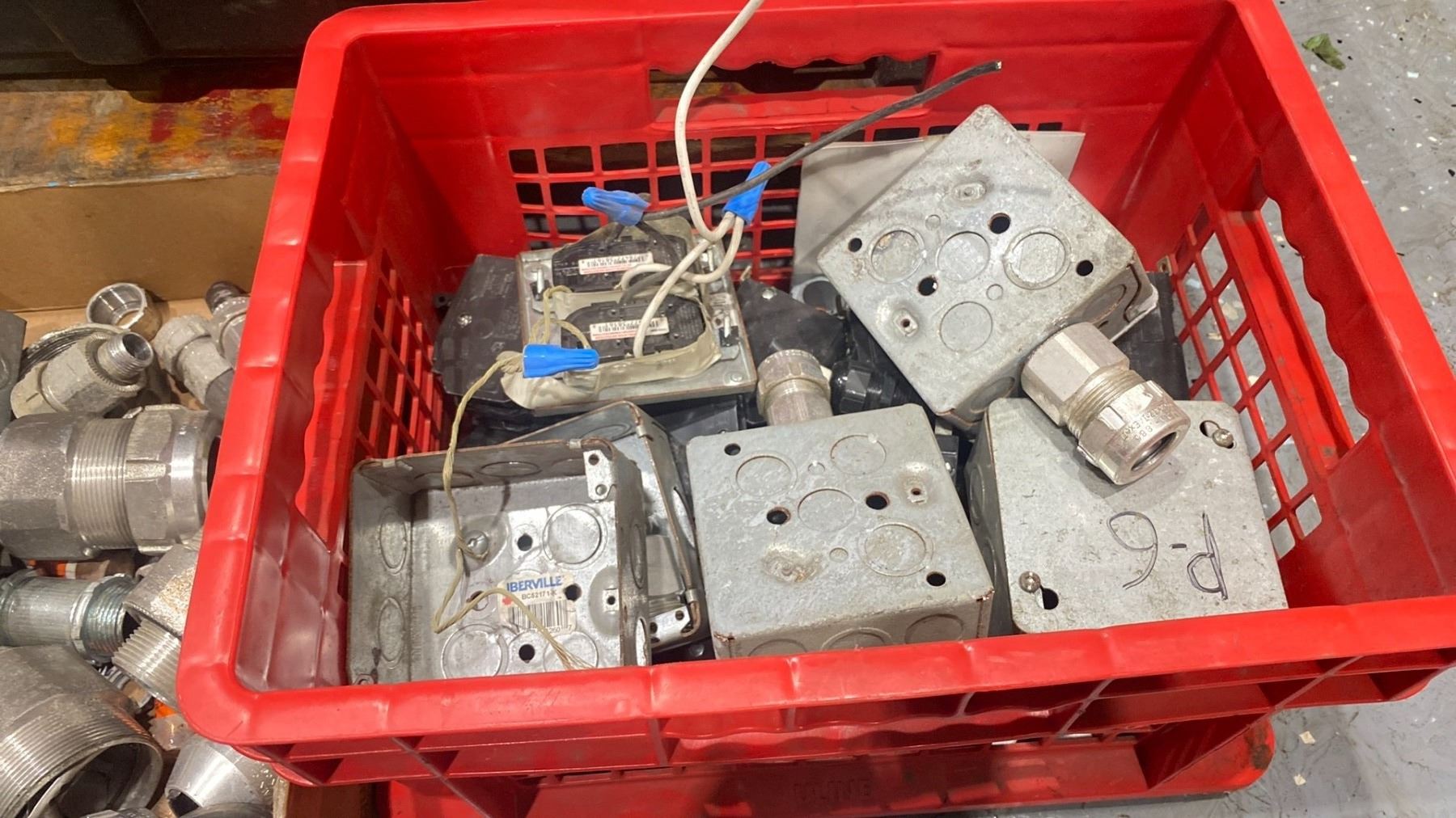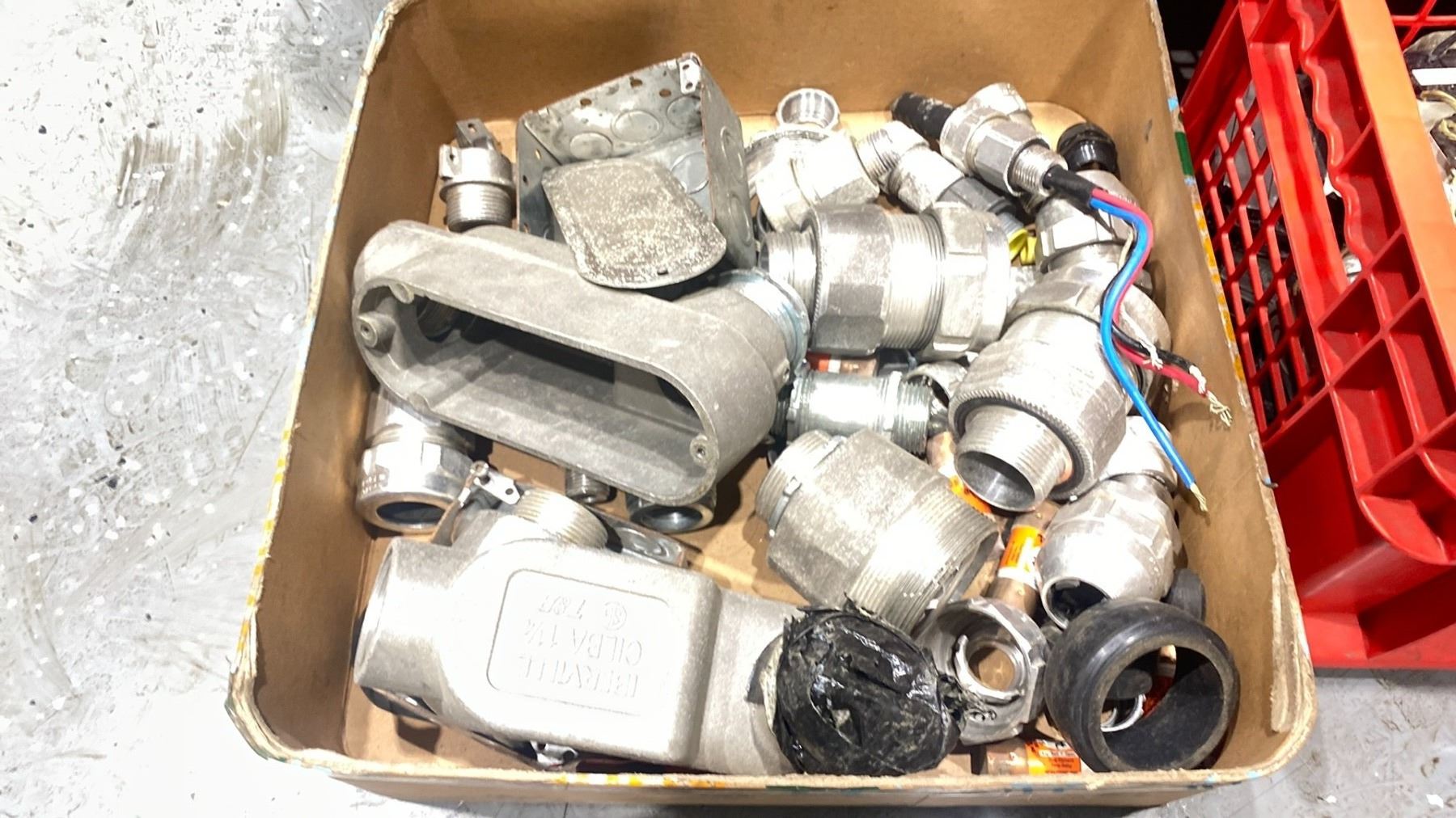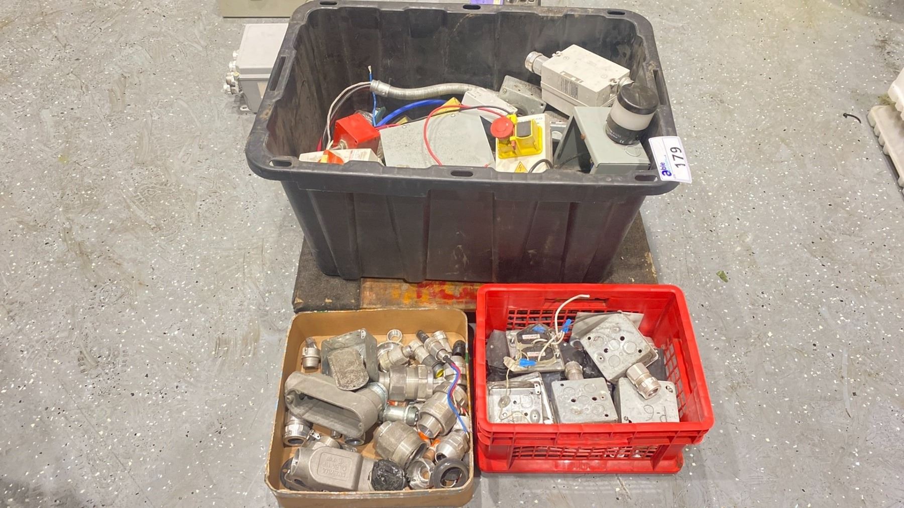 3 BOXES OF ELECTRICAL BOXES, FITTINGS, & ASSORTED ELECTRICAL COMPONENTS
