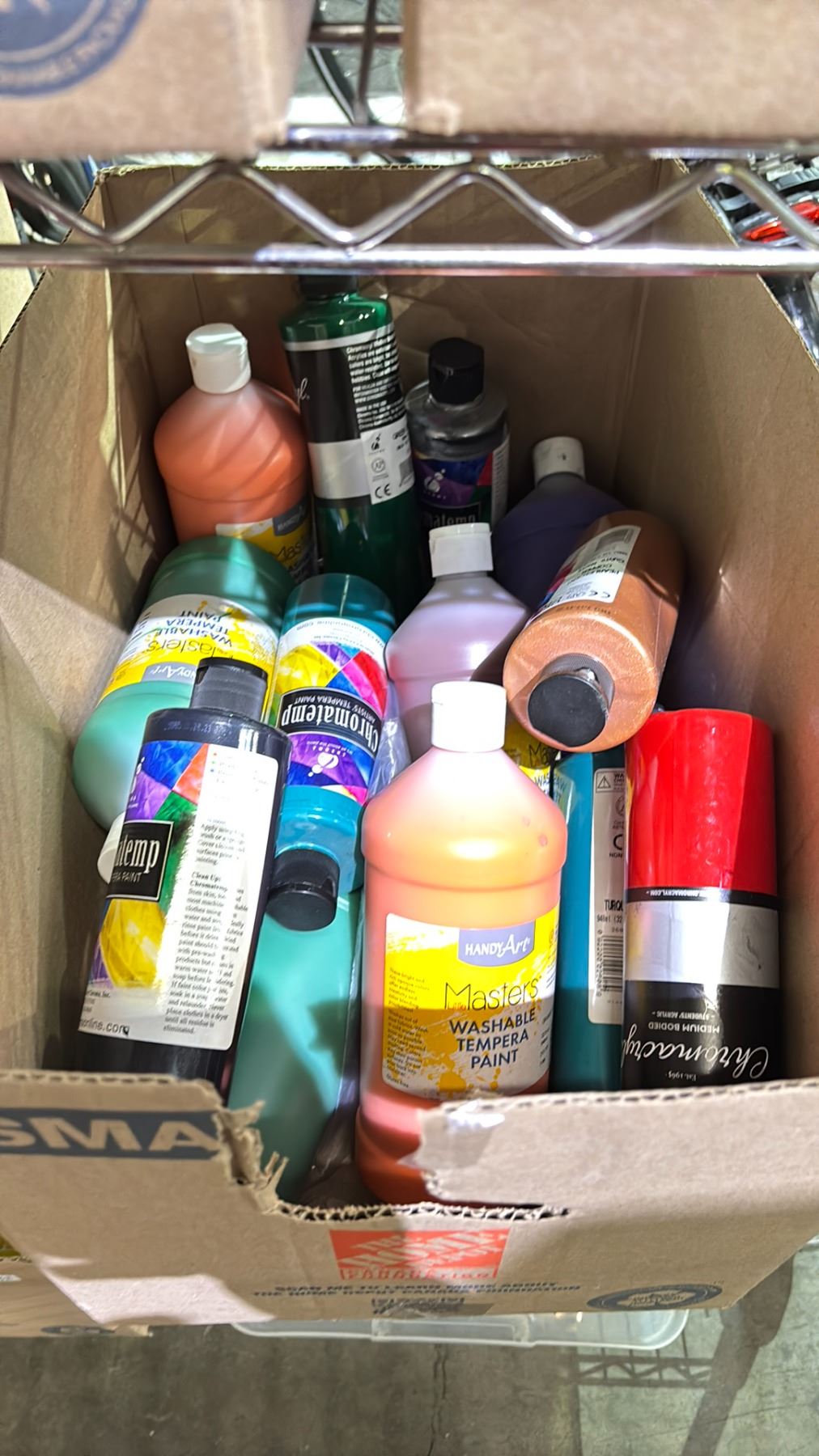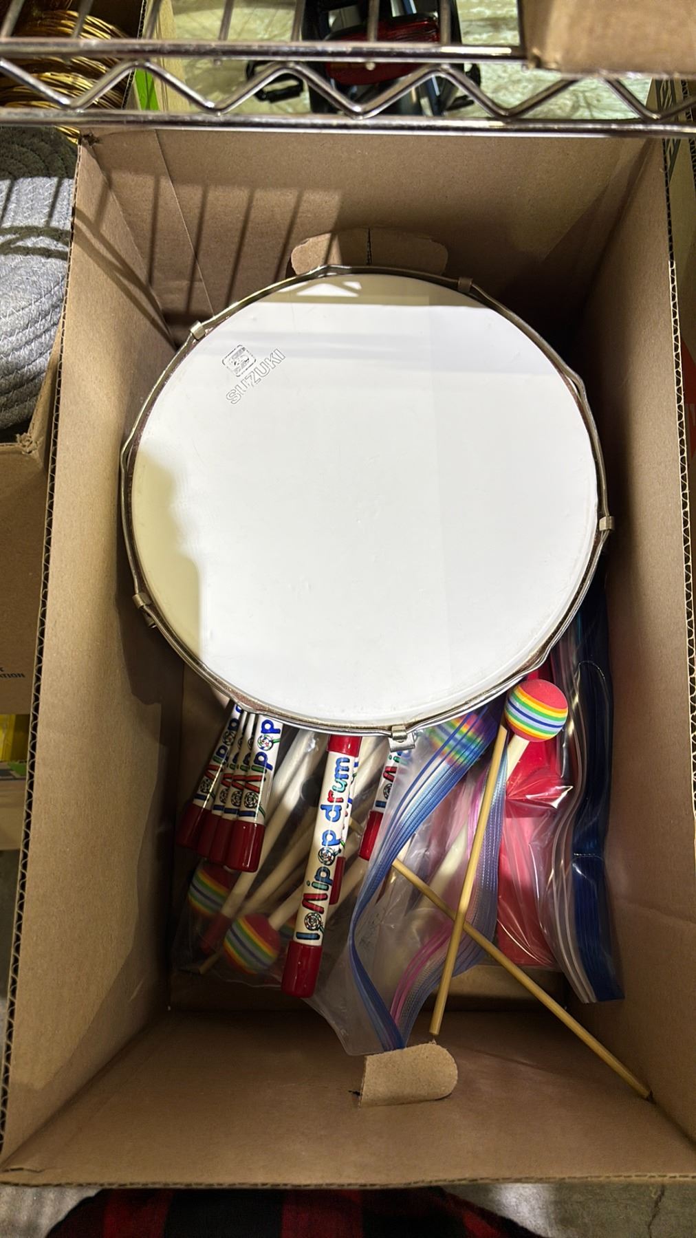 3 BOXES OF TEMPERA PAINT, LOLLIPOP DRUMS & BASKETS