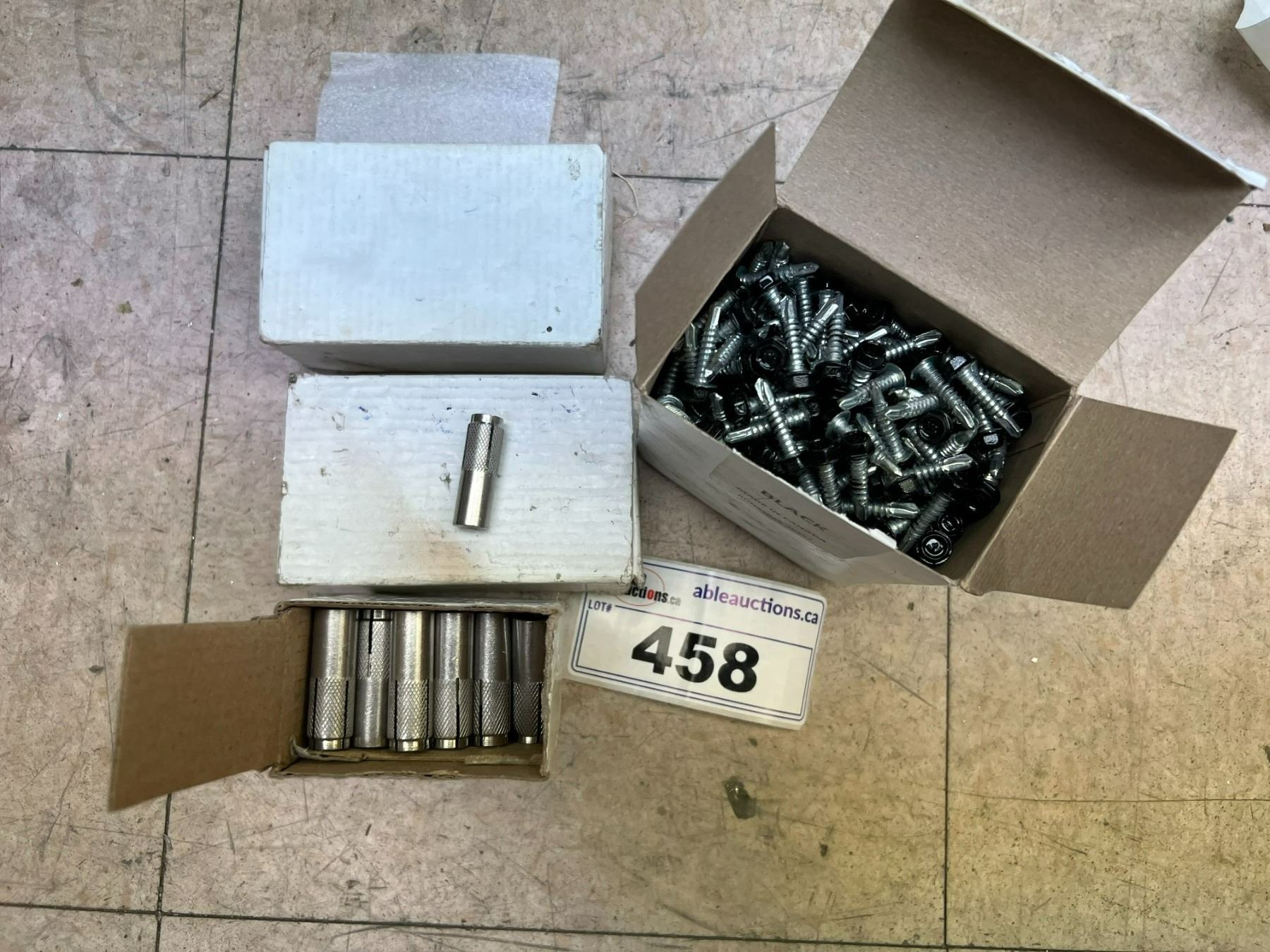 3 BOXES (TOTAL PIECES) 3/8" STAINLESS STEEL DROP IN ANCHORS PLUS 5-PIECES NO. 12 X 1" HEX HEAD SELF DRILLING SCREWS