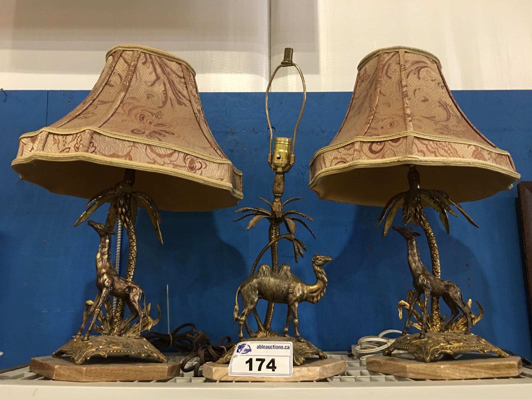 3 BRASS WITH MARBLE BASE AFRICAN MOTIF ANIMAL LAMPS - GIRAFFE & CAMEL