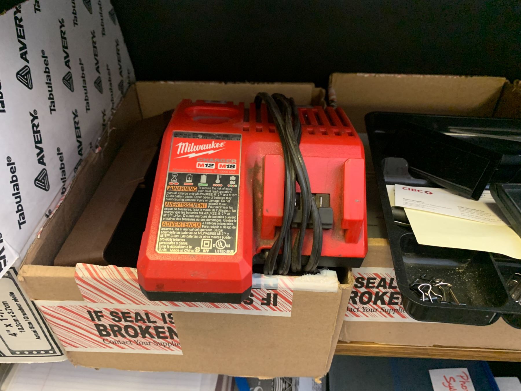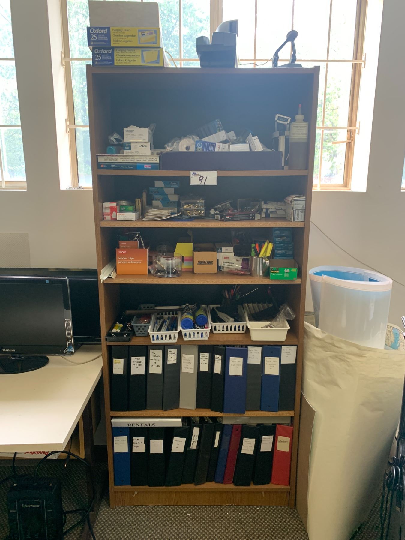 3 BROWN WOODEN BOOKSHELVES WITH ASSORTED OFFICE CONTENTS INCLUDING A MILWAUKEE BATTERY CHARGER, SHELF OF PAPER & A CORKBOARD