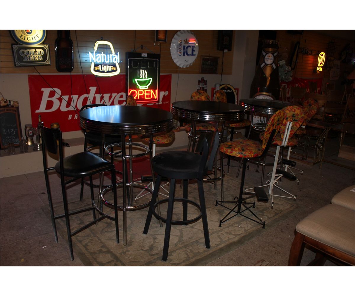 3 CAFE TABLES, 6 FLORAL PRINT STOOLS, 3 BLACK STOOLS