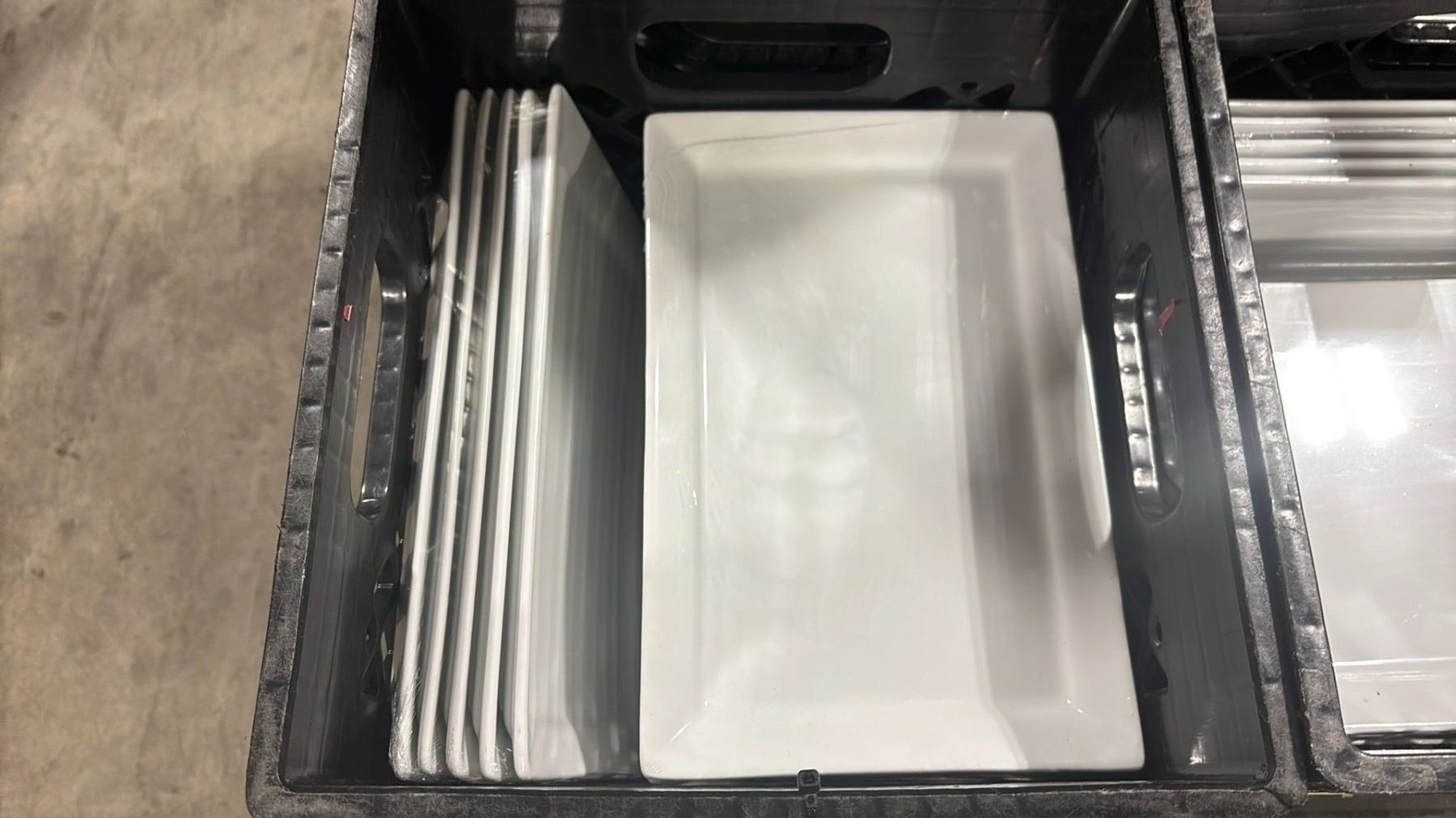 3 CRATES OF WHITE 12" COMMERCIAL RESTAURANT RECTANGULAR PLATES *CRATES INCLUDED* ( APPROX. 20 PLATES PER CRATE, 60 PLATES TOTAL )