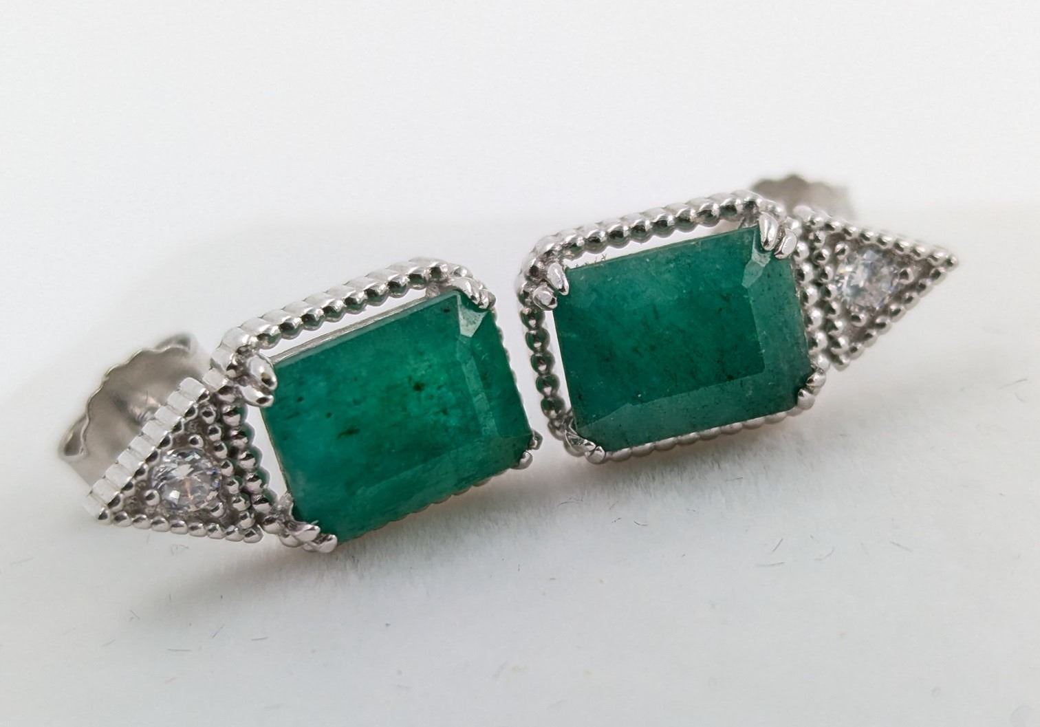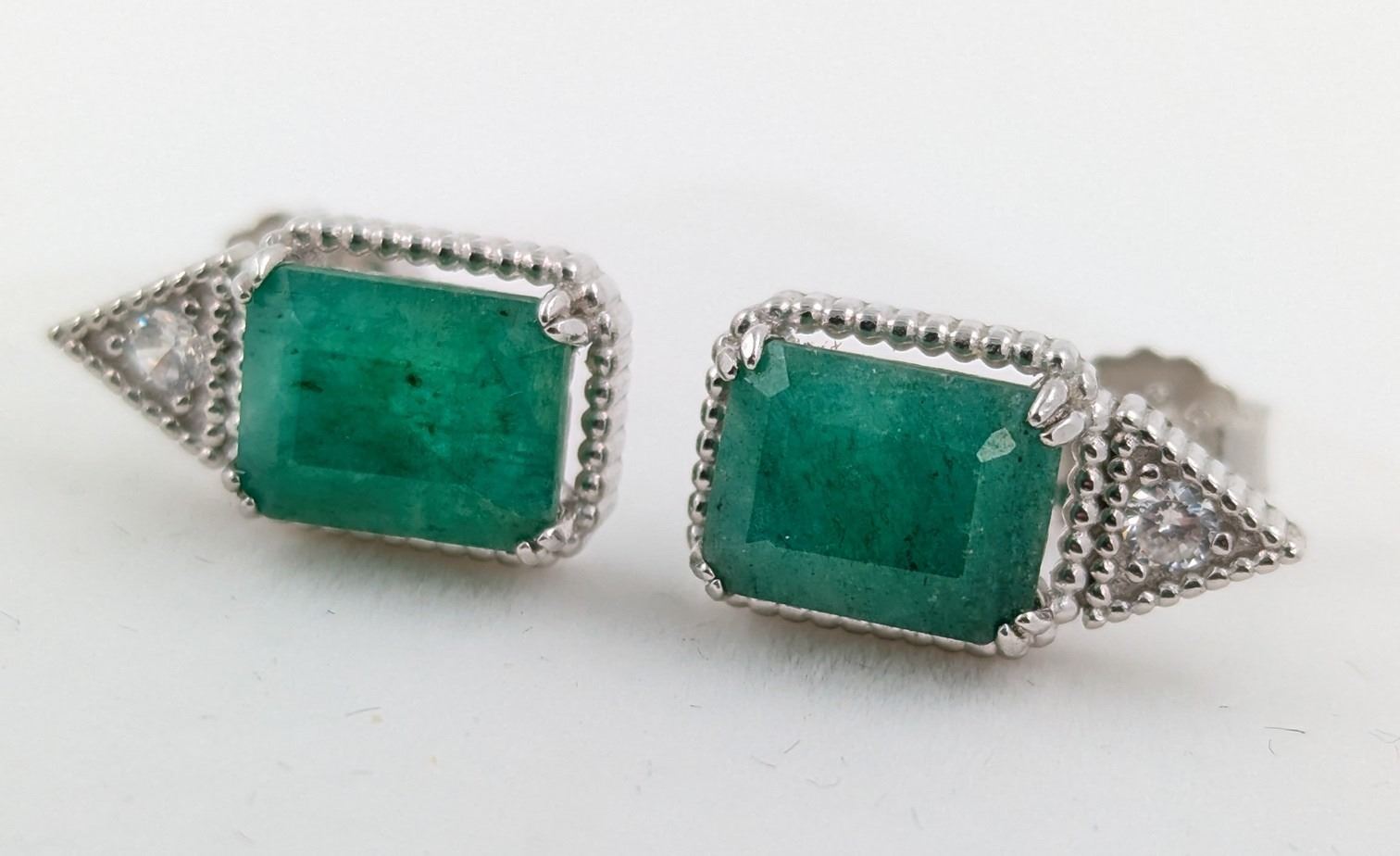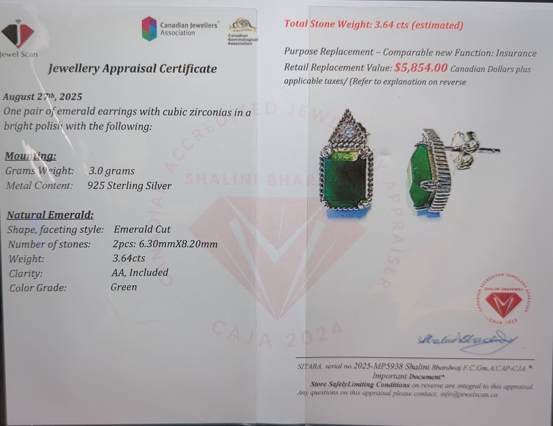 3 CT CERTIFIED SILVER EMERALD GEMSTONE EARRINGS ($5,854 APPRAISAL, APPRAISAL NOT GUARANTEED)