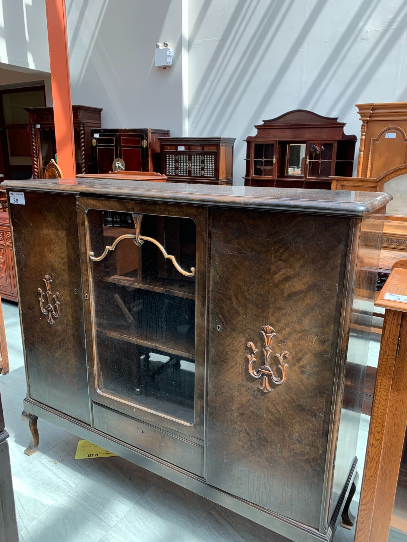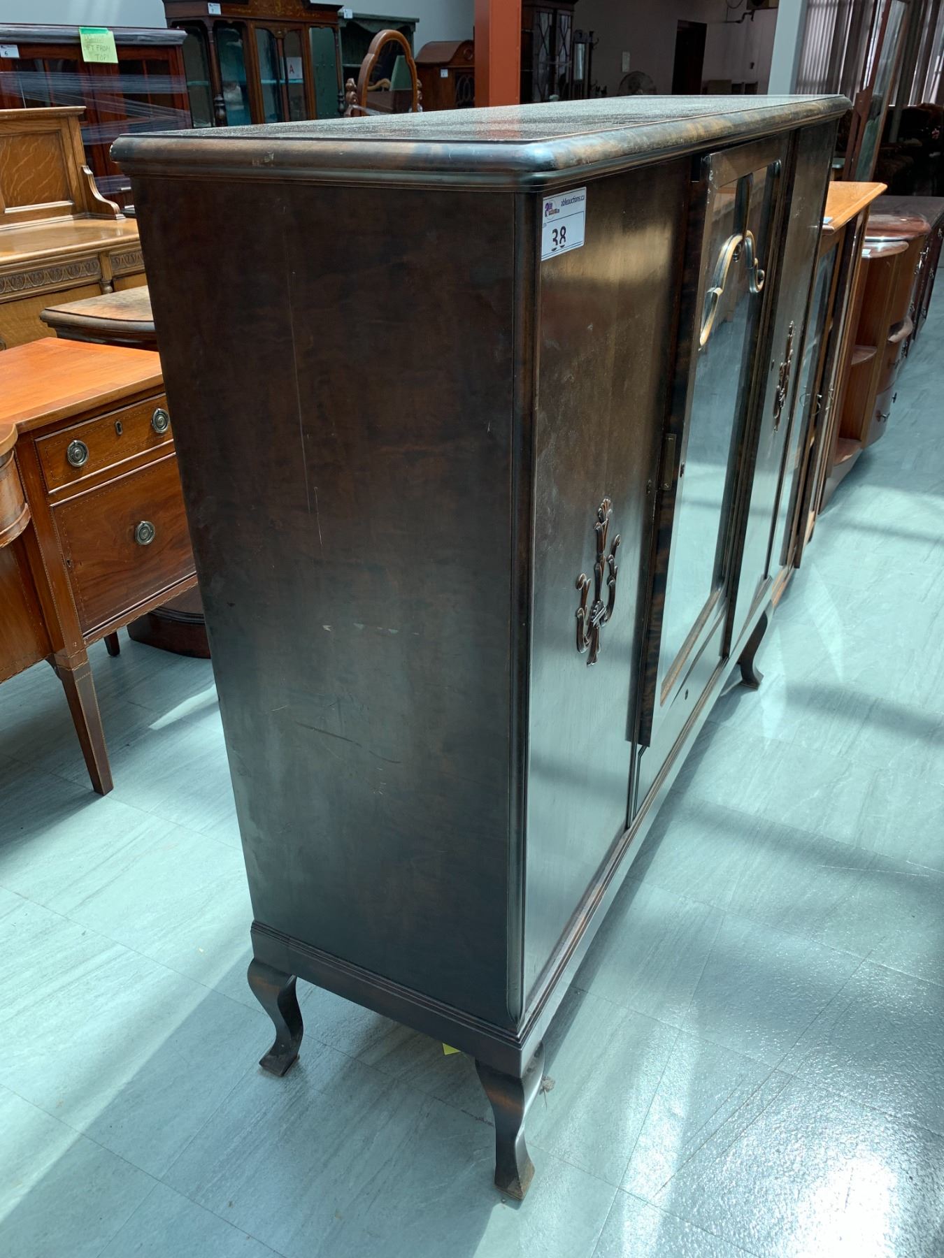 3 DOOR 1 DRAWER GLASS FRONT WOOD LOCKING CABINET (NO KEY) APPROX 55"X60"X18"
