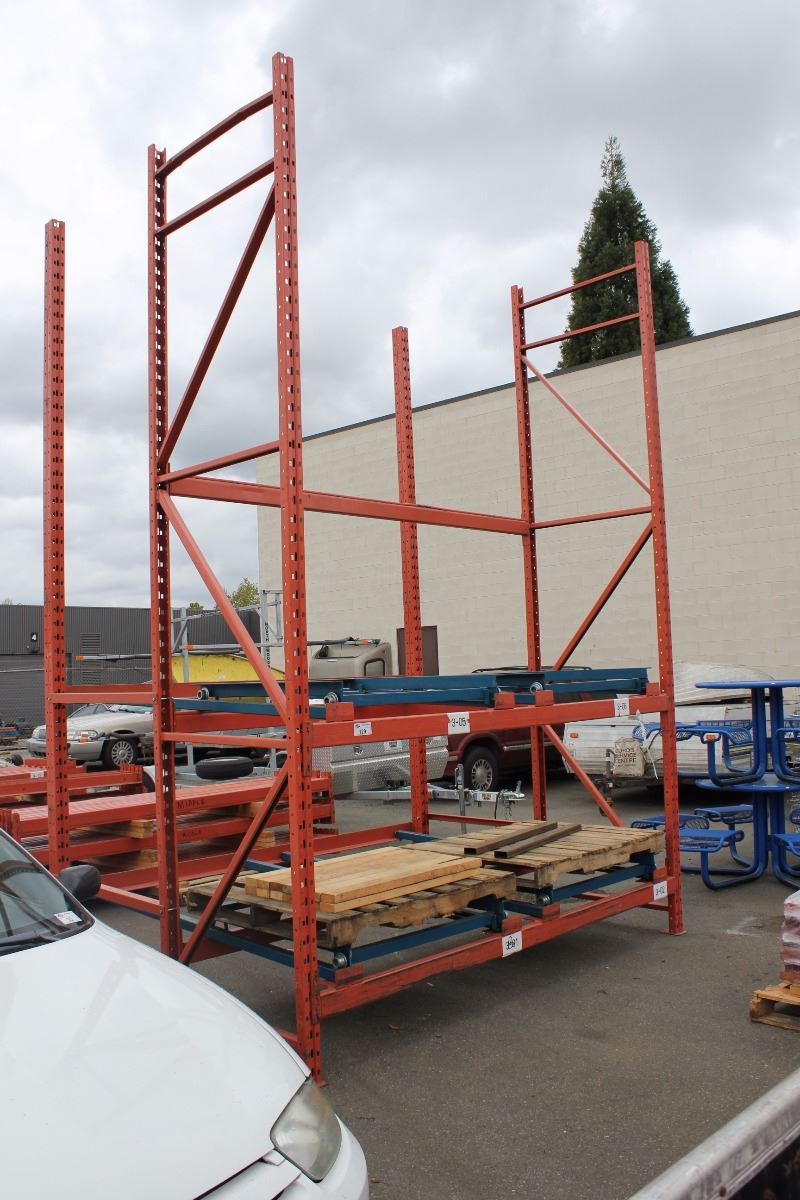 3 DOUBLE BAYS OF 42"X12' PUSH BACK PALLET RACKING WITH UPRIGHTS SINGLE UPRIGHTS, CROSSBARS, ROLLERS ETC