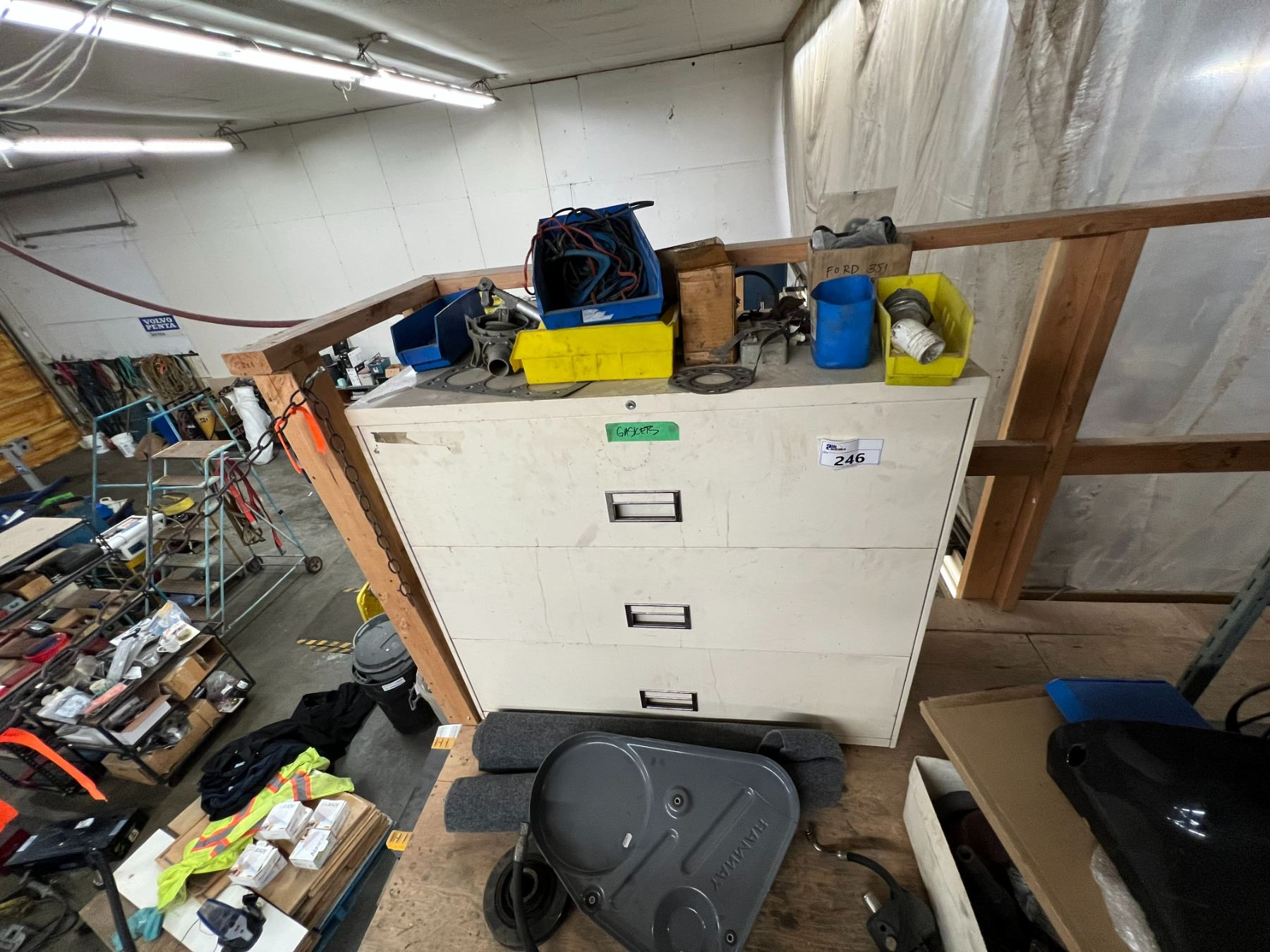 3 DR FILE CABINET FULL OF GASKETS AND BOX OF GASKETS AND BOX OF MERCURY DECALS