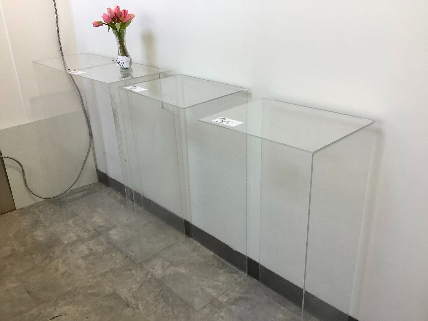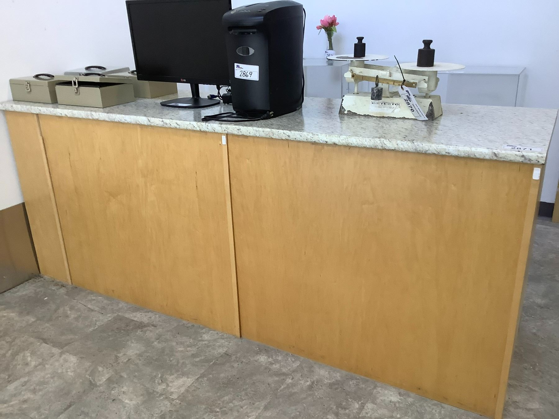 3 DRAWER 2 DOOR RECEPTION DESK 92"X27"X36"H WITH INSIDE CONTENTS, 3 CLEAR SHELVES & VASE