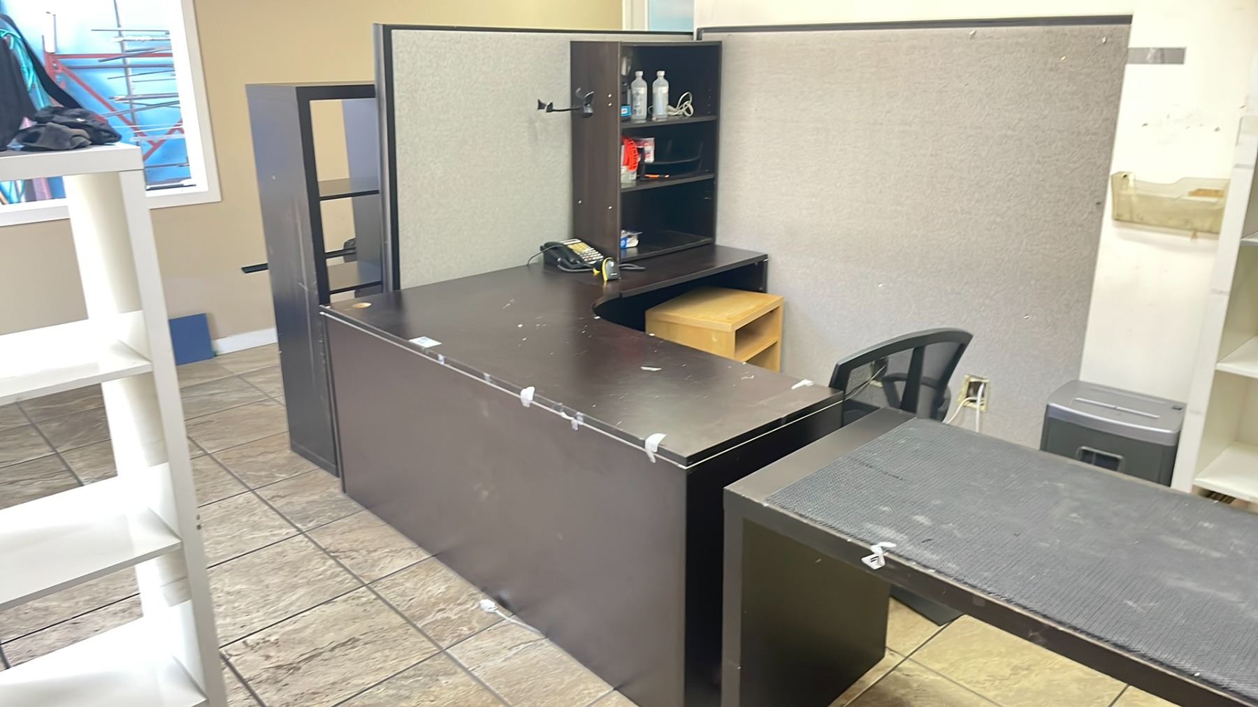 3 DRAWER L SHAPE OFFICE DESK, DARK WOOD 2 DRAWER OFFICE DESK MULTIPLE SECTION SHELFING UNIT, SMALL SHELFING UNIT AND DIVIDERS AND ONE WOODEN ROLLING CUBBY UNIT, BLACK MESH ROLLING CHAIR AND ELECTRIC PAPER SHEDDER