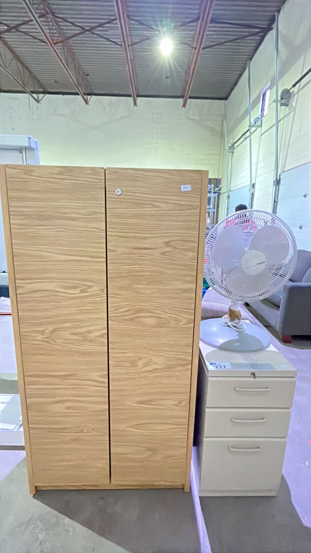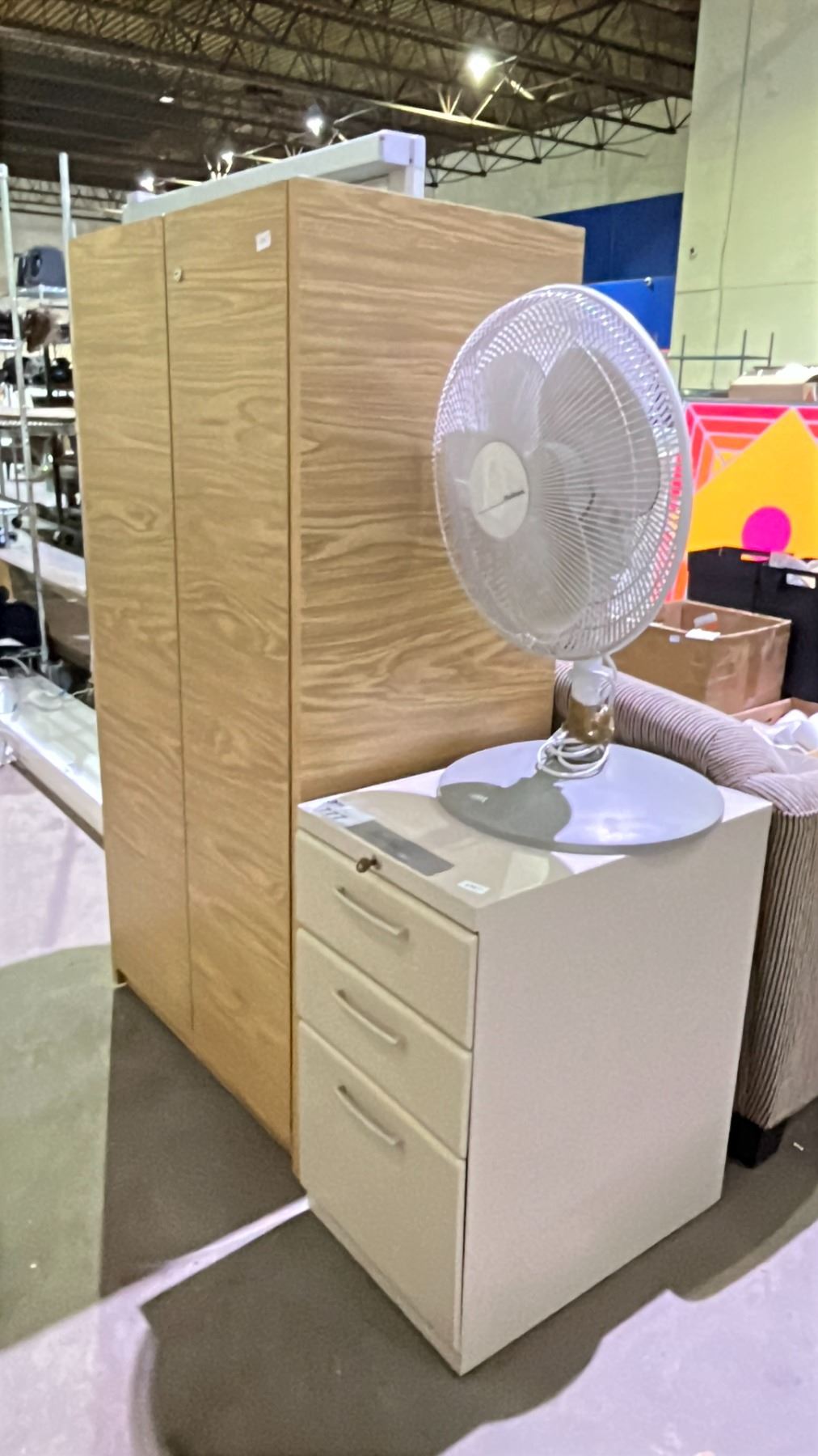 3 DRAWER METAL FILE CABINET, 2 DOOR WOOD CABINET & HOLMES FAN
