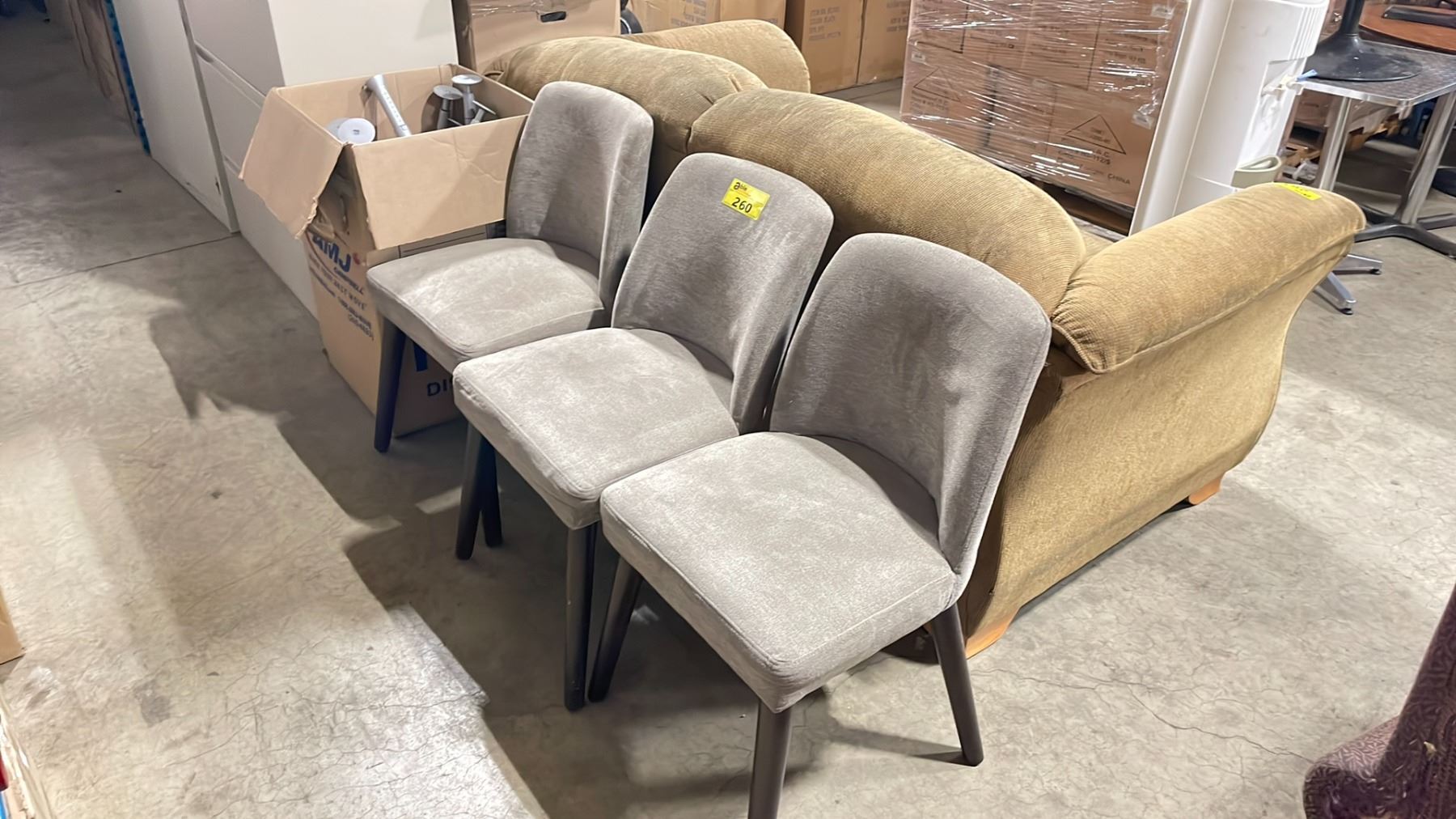 3 GREY PADDED SIDE CHAIRS & BOX OF METAL TABLE SUPPORT LEGS