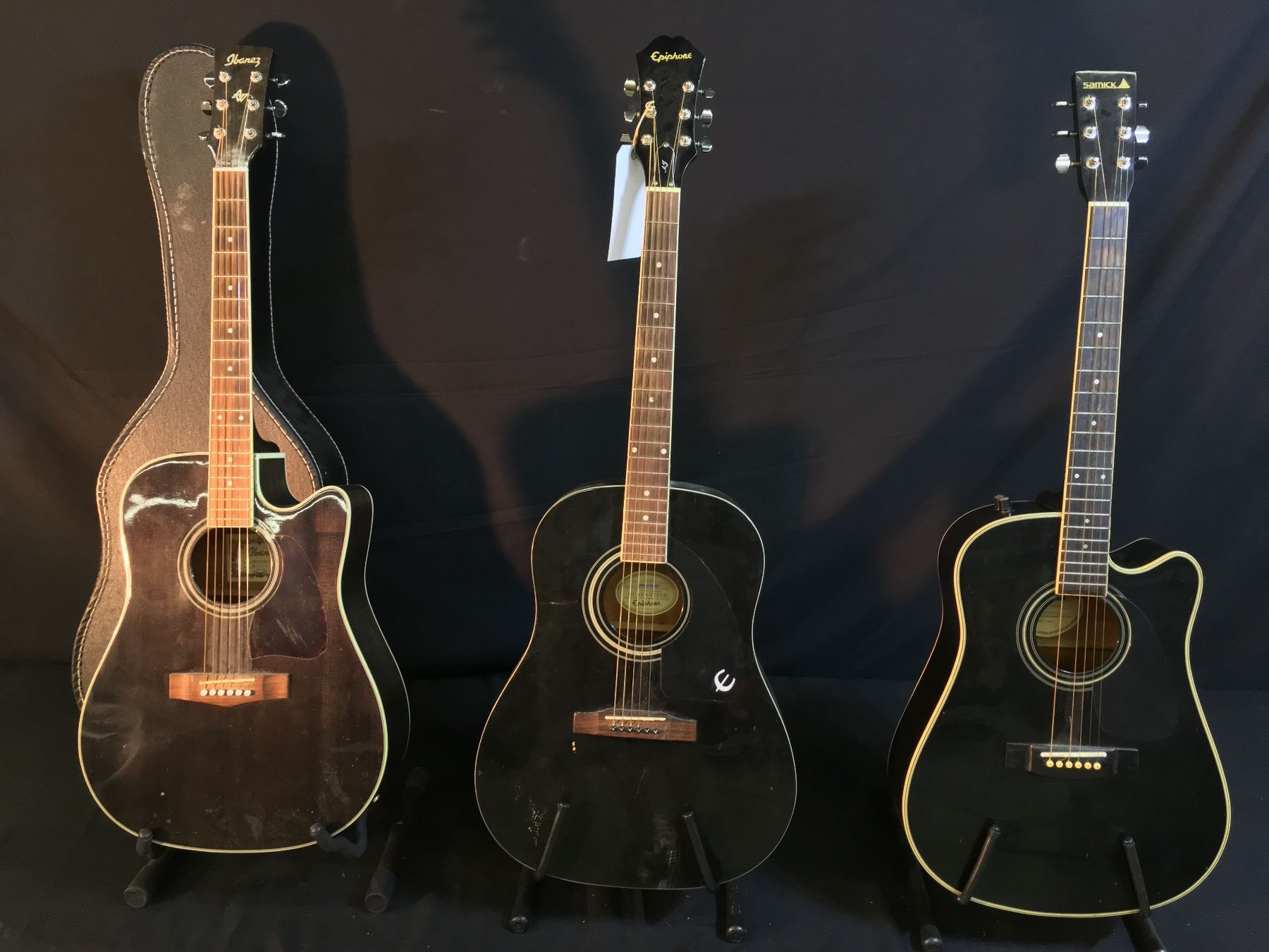 3 GUITARS: EPIPHONE MODEL AJ-100 ACOUSTIC GUITAR, SAMICK MODEL SW 210 CUTAWAY ACOUSTIC GUITAR, AND IBANEZ MODEL AW60CE CUTAWAY ACOUSTIC/ELECTRIC GUITAR WITH HARD SHELL CASE
