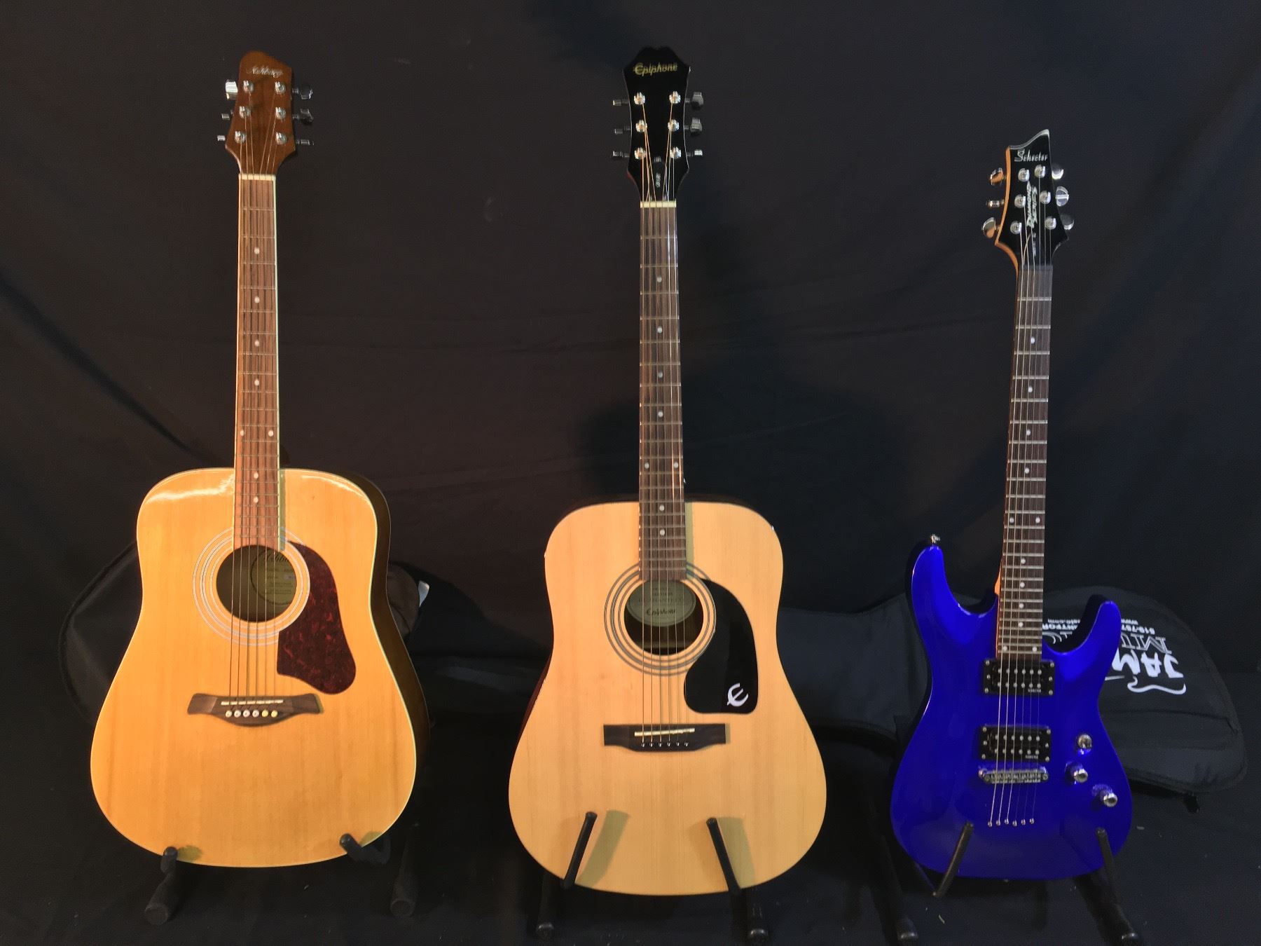 3 GUITARS: SCHECTER DIAMOND SERIES OMEN-6 ELECTRIC GUITAR WITH SOFT SHELL CASE, EPIPHONE MODEL DR-100 ACOUSTIC GUITAR, AND ASHBURY MODEL AG-100 ACOUSTIC GUITAR WITH SOFT SHELL CASE