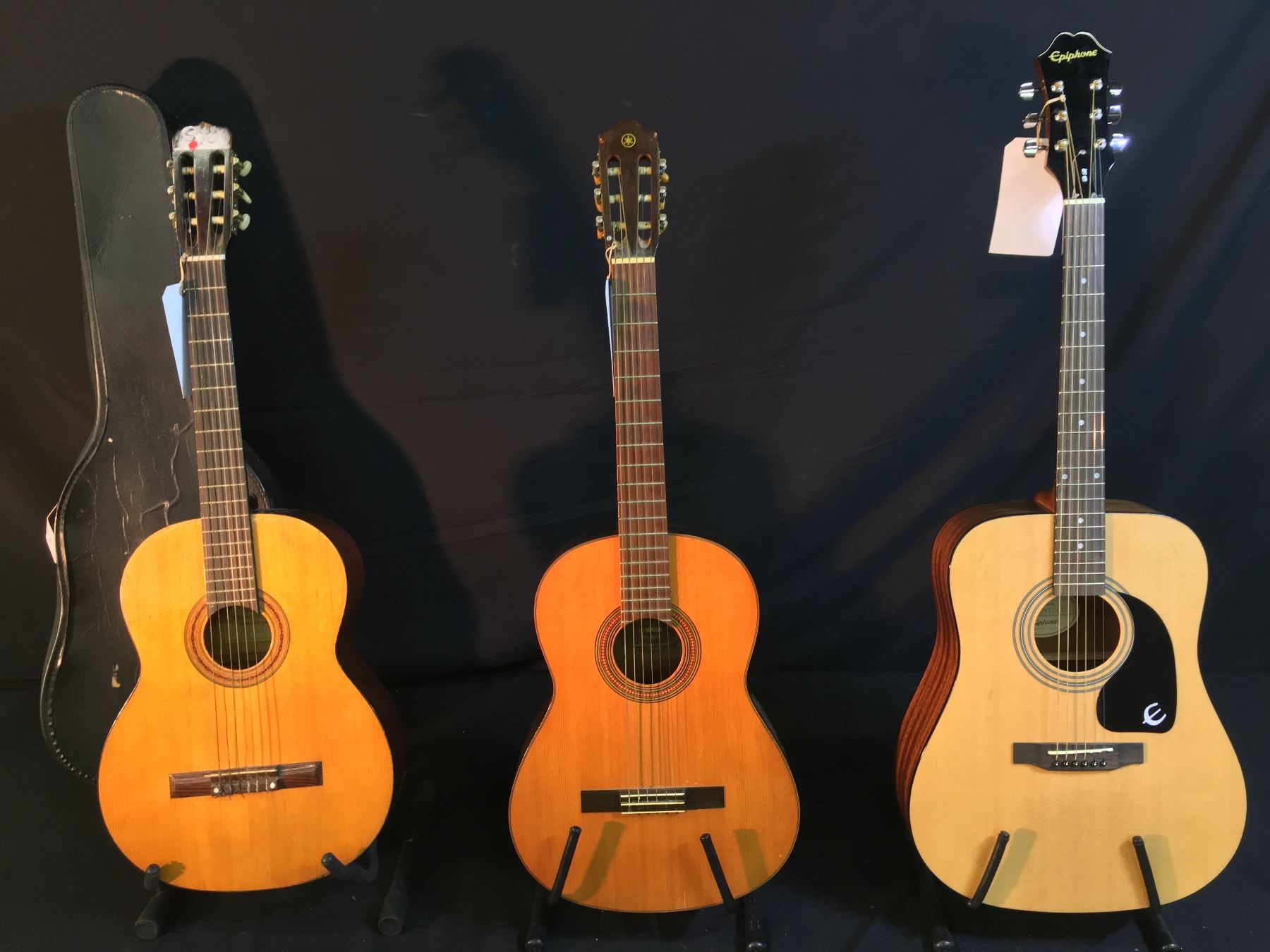 3 GUITARS: VINTAGE YAMAHA MODEL G-50A ACOUSTIC GUITAR, MADE BY NIPPON GAKKI CO. IN JAPAN, EPIPHONE MODEL DR-100 ACOUSTIC GUITAR, AND REGENT MODEL 480-A ACOUSTIC GUITAR, MADE IN JAPAN, WITH HARD SHELL CASE