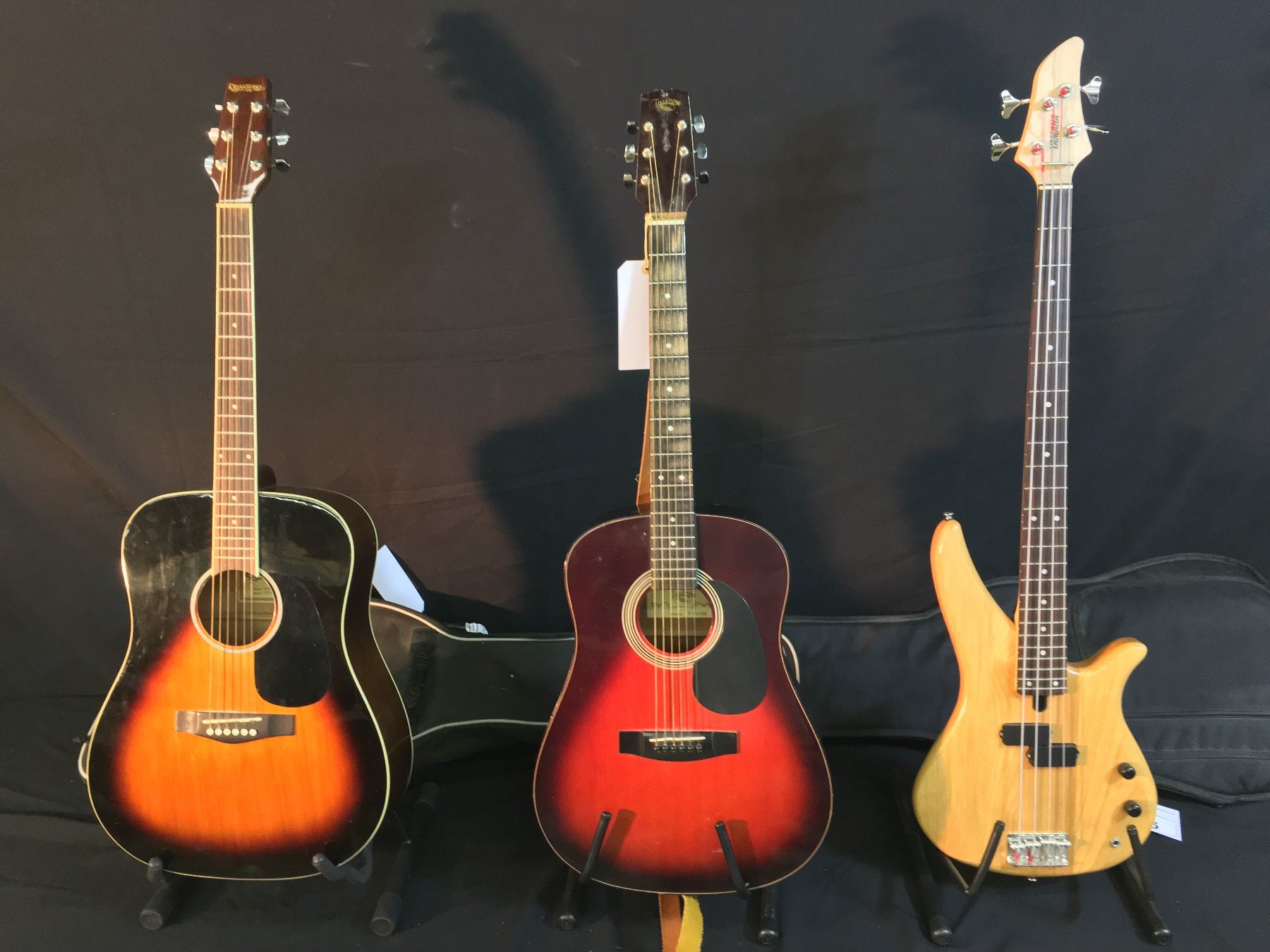 3 GUITARS: YAMAHA NATURAL WOOD SINGLE PICKUP BASS GUITAR WITH SOFT SHELL CASE, TRADITION MODEL W72DRS ACOUSTIC GUITAR, AND RENAISSANCE ACOUSTIC GUITAR WITH SOFT SHELL CASE