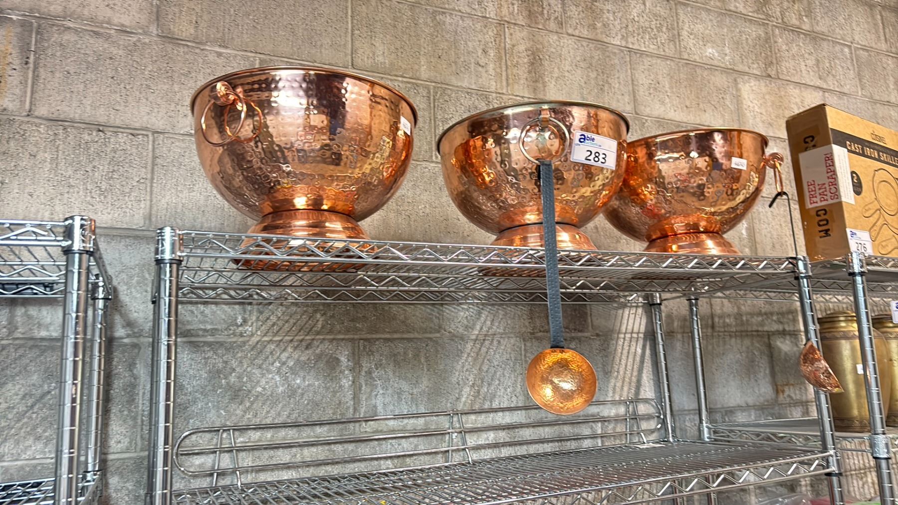 3- HAMMERED WALL COPPER PUNCH BOWLS WITH 2 SERVING SPOONS