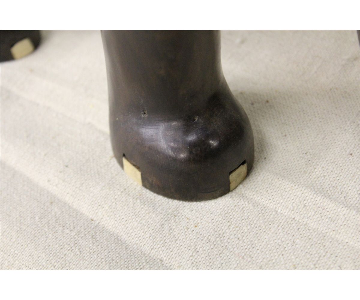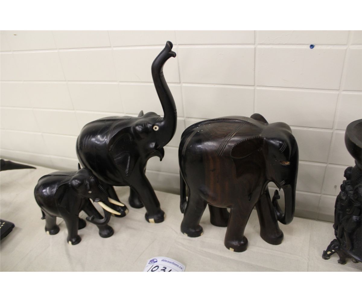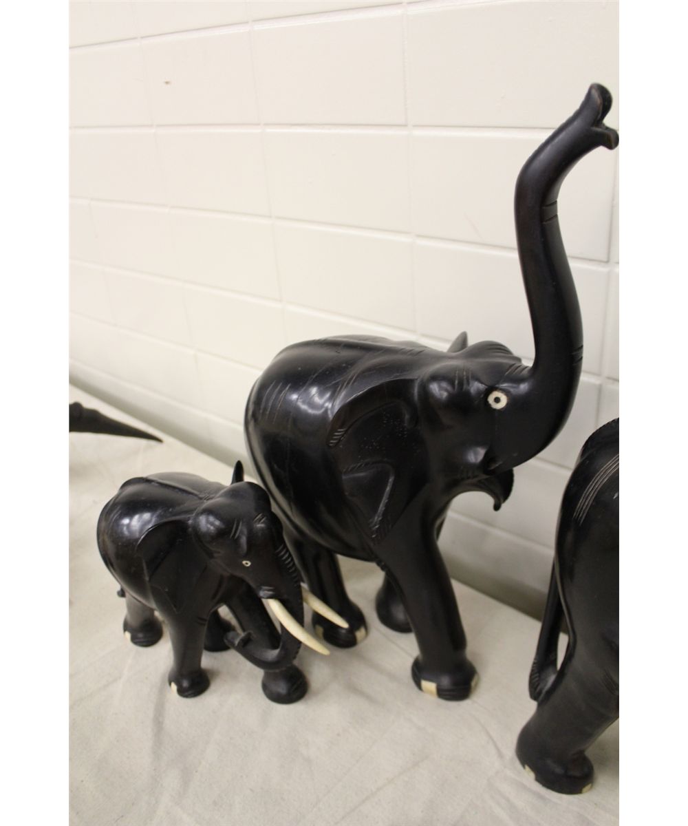 3 HAND CARVED EBONY ELEPHANT WITH TRUNK EXTENDED, 18" TALL (TO TOP OF TRUNK) IVORY INLAID INTO FEET TUSKS MISSING, 12" TALL IVORY INLAID IN FEET AND EYE, TUSKS MISSING AND 8" TALL IVORY INLAID INTO FEET AND EYE