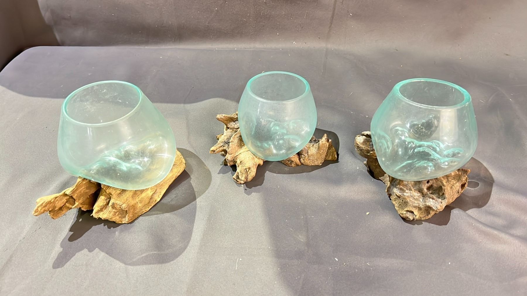 3 HAND MADE MOLTEN GLASS BOWLS ON TEAK BASES *PICTURE IS NOT EXACT REPRESENTATION*