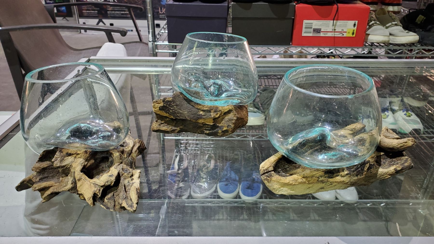 3 HAND MADE MOLTEN GLASS BOWLS ON TEAK BASES
