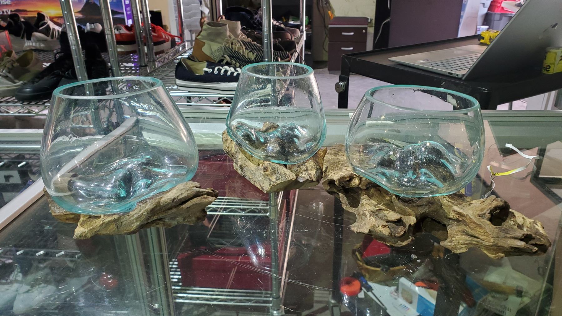 3 HAND MADE MOLTEN GLASS BOWLS ON TEAK BASES