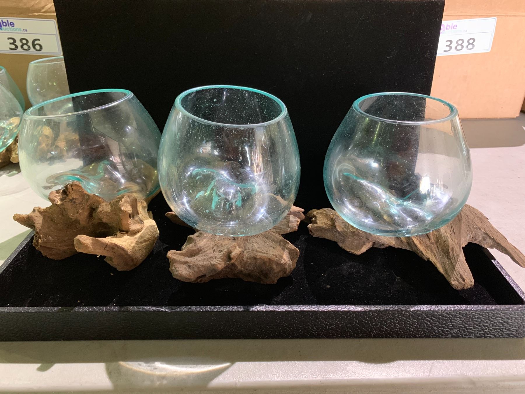 3 HAND MADE MOLTEN GLASS BOWLS ON TEAK BASES